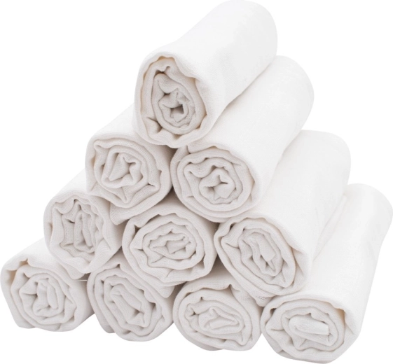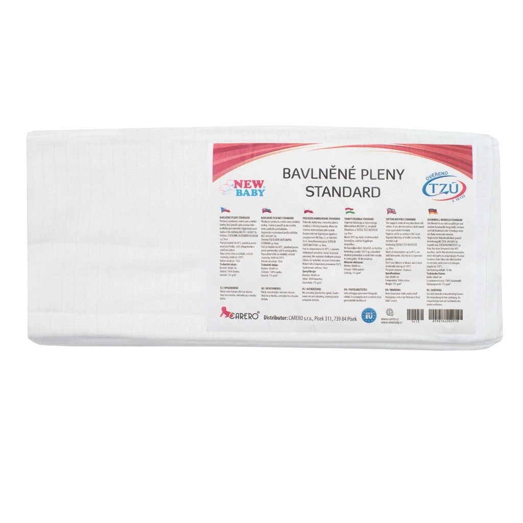Praktikus NEW BABY pamut pelenkák 60 × 80 cm méretben, 10 darabos csomagban, ideálisak a mindennapi babagondozáshoz. 100% pamutból készülnek, 115 g/m² grammsúllyal, 2 erősített és 2 beszegett széllel a nagyobb tartósságért. Ellenőrizte a Brnói Textilipari Vizsgálóintézet. Szárítógépben szárítani nem ajánlott.