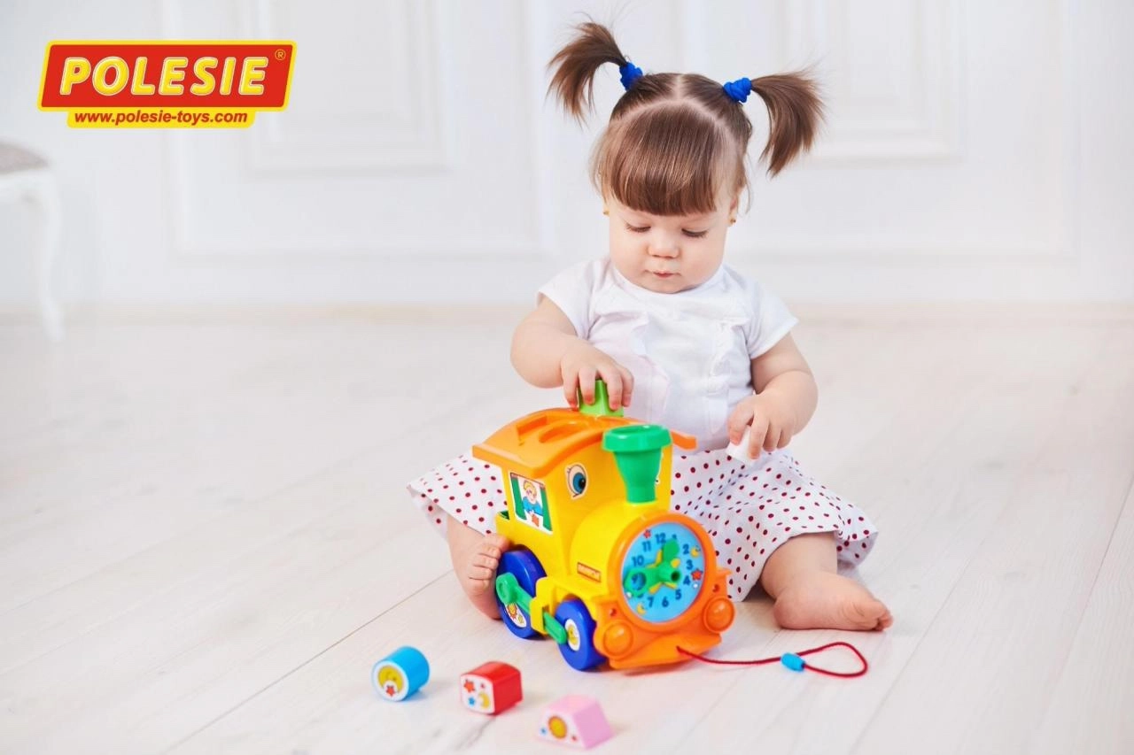 A vonat tartós műanyagból készült, sima élekkel és kellemes színekkel. A gyermek könnyedén húzhatja a zsinórnál fogva, és a formákat a megfelelő helyekre illesztheti. A mutatós óra játékos formában segíti az alapvető időérzék kialakítását.