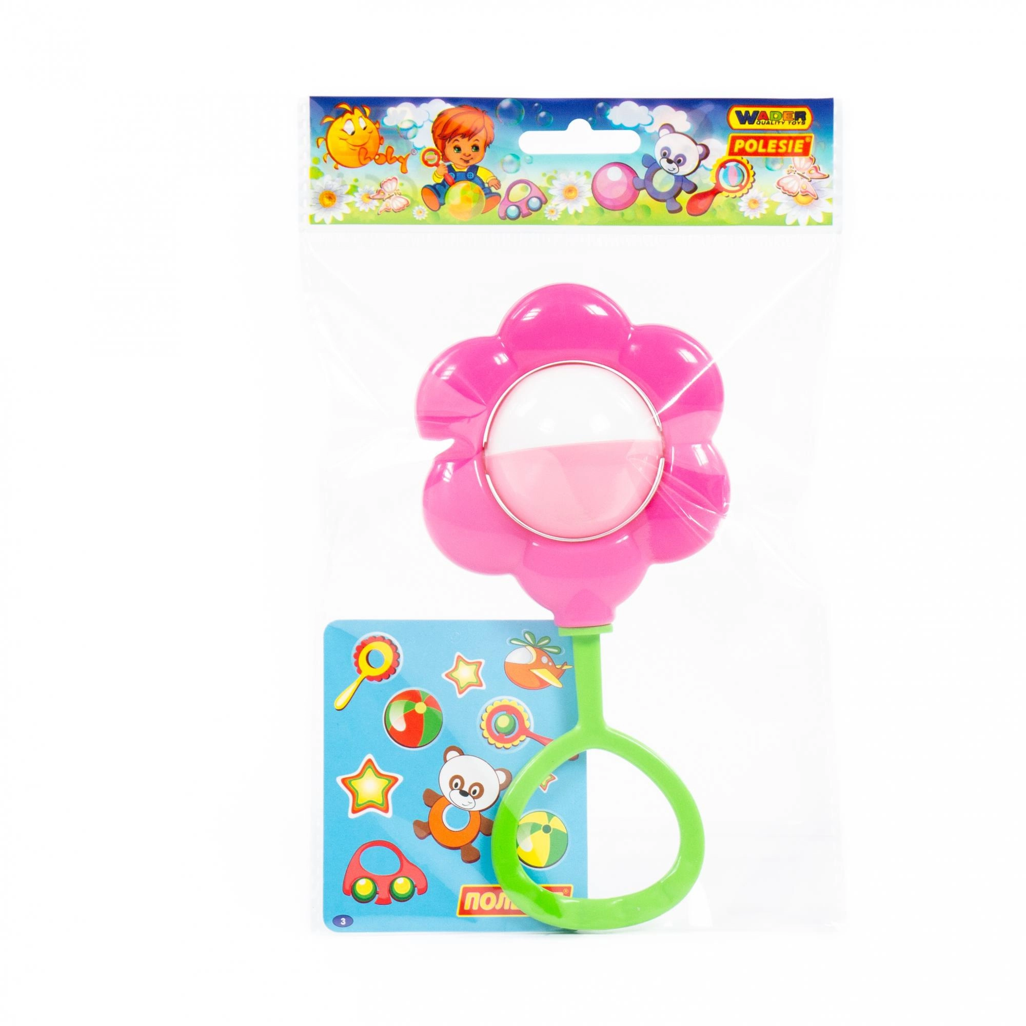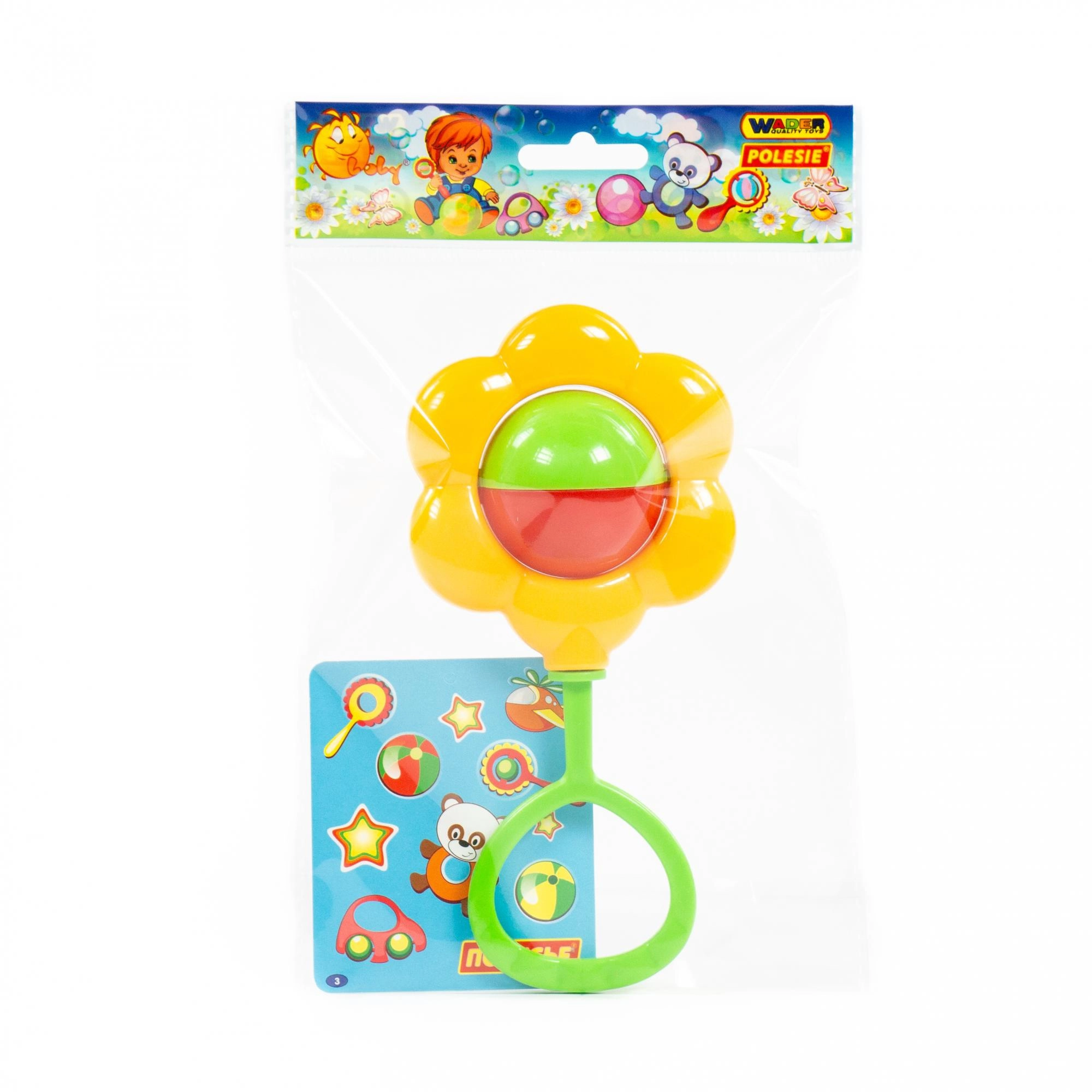 A csörgő kiváló minőségű, egészségre ártalmatlan, tanúsított műanyagból készül. A virág közepén lévő forgó golyó mozgás közben kellemes hangot ad, amely serkenti a látást, a hallást és a kéz–szem koordinációt. A színt az aktuális raktárkészlet szerint küldjük.