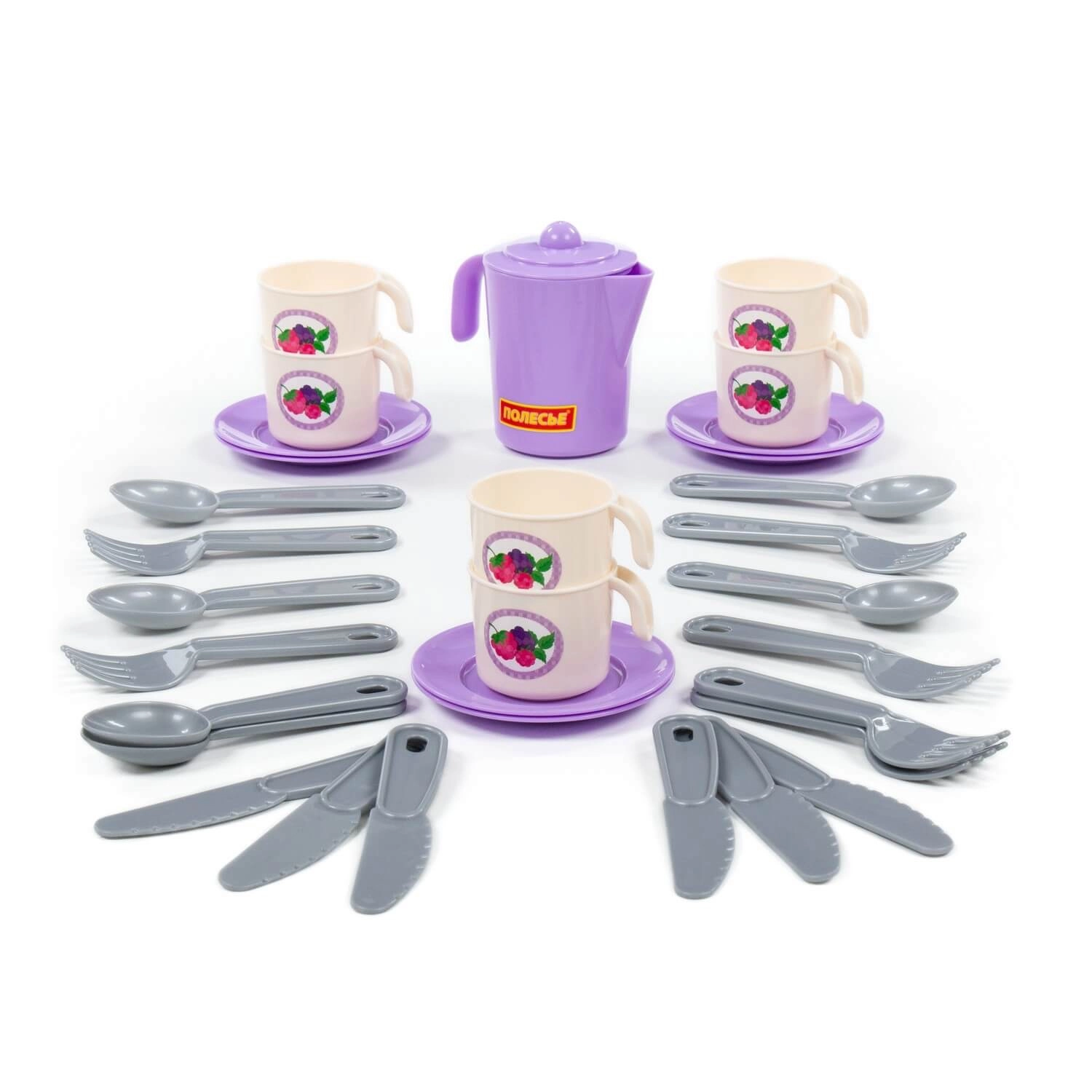 - Teljes készlet 6 személyre – csészék, tányérok, kanna fedővel és evőeszközök.
