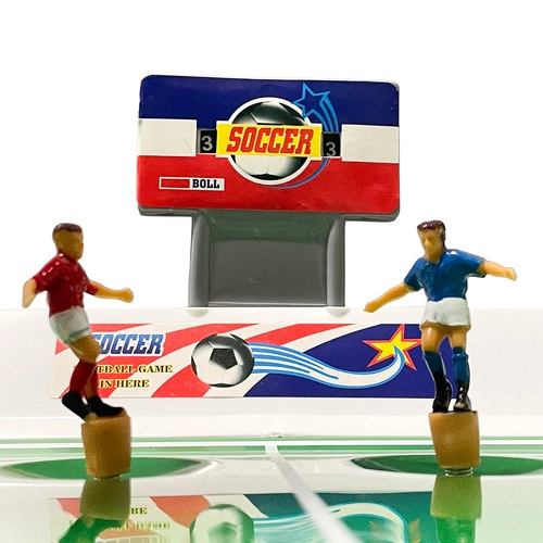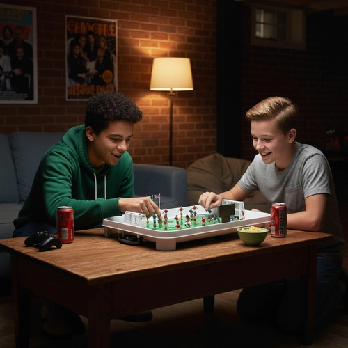Élvezze az izgalmas meccseket a kompakt pályán, élethű 11 játékosos csapatfelállással. A rugós mechanizmus gyors lövéseket, passzokat és kapusvédéseket biztosít elektromos táp nélkül. A tartós műanyag szerkezet könnyű és egyszerűen hordozható, így bárhol játszhat – otthon, a nyaralóban vagy barátoknál.