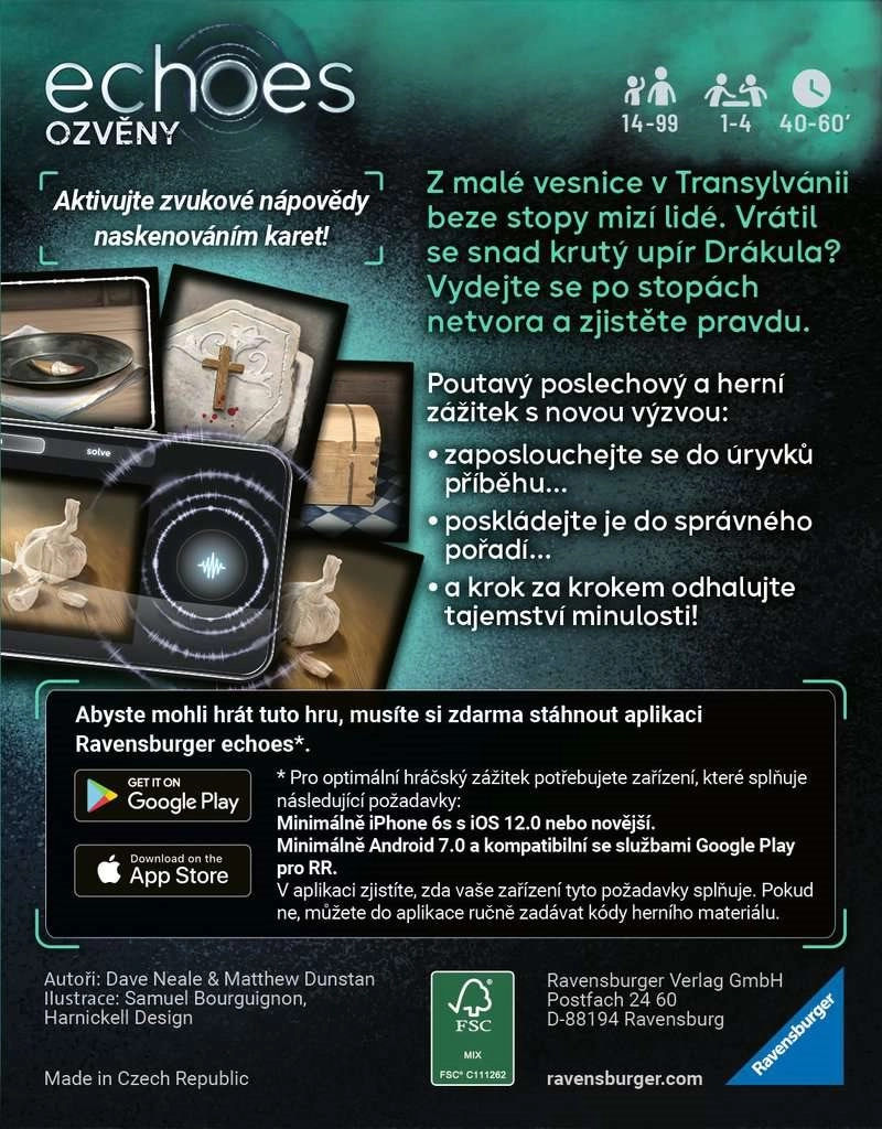 A Drakula öröksége epizódban egy kis erdélyi faluban találod magad, ahol kegyetlen vámpírról szóló hírek keringenek. A cseh szinkronnak (narrátor: Václav Neužil) köszönhetően egy hangulatos, feszültséggel, dedukcióval és okos útmutatókkal teli történetet élvezhetsz. A játék ideális közös estékhez, fejleszti a megfigyelőkészséget, a logikus gondolkodást és a csapatmunkát.