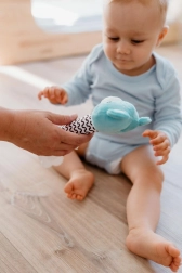 Megnyomáskor a játék megnyugtató sípoló hangot ad, amely természetes módon felkelti a baba figyelmét és támogatja a hallási észlelés fejlődését.
