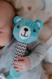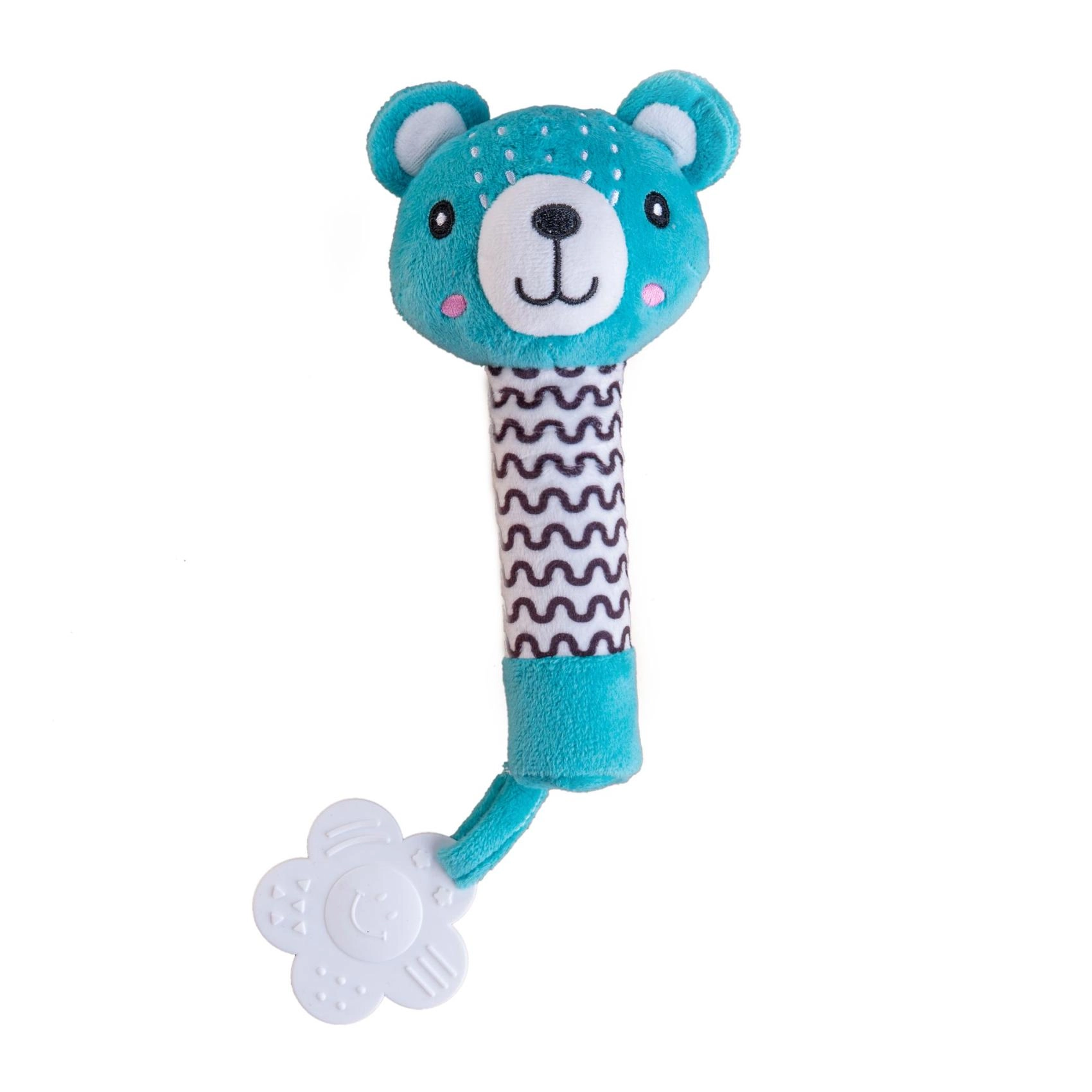 Ez a pihe-puha sípoló játék virág alakú rágókával és maci formával egyszerre nyújt megnyugvást és szórakozást a babáknak. A hosszú, vékony fogórész könnyen megfogható, a finom sípoló hang fejleszti a hallást, a virág alakú rágóka pedig segít az első fogacskák kibújásakor. A puha plüss kellemes tapintású, újszülött kortól megfelelő.