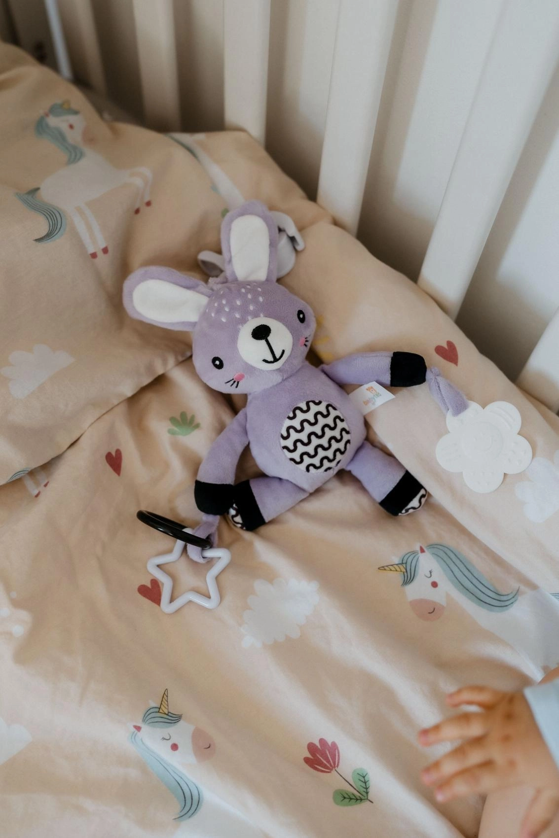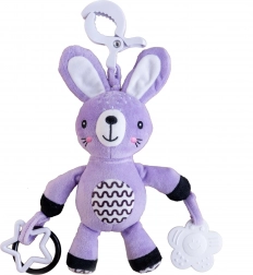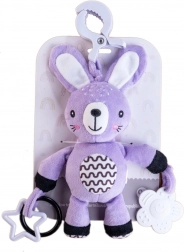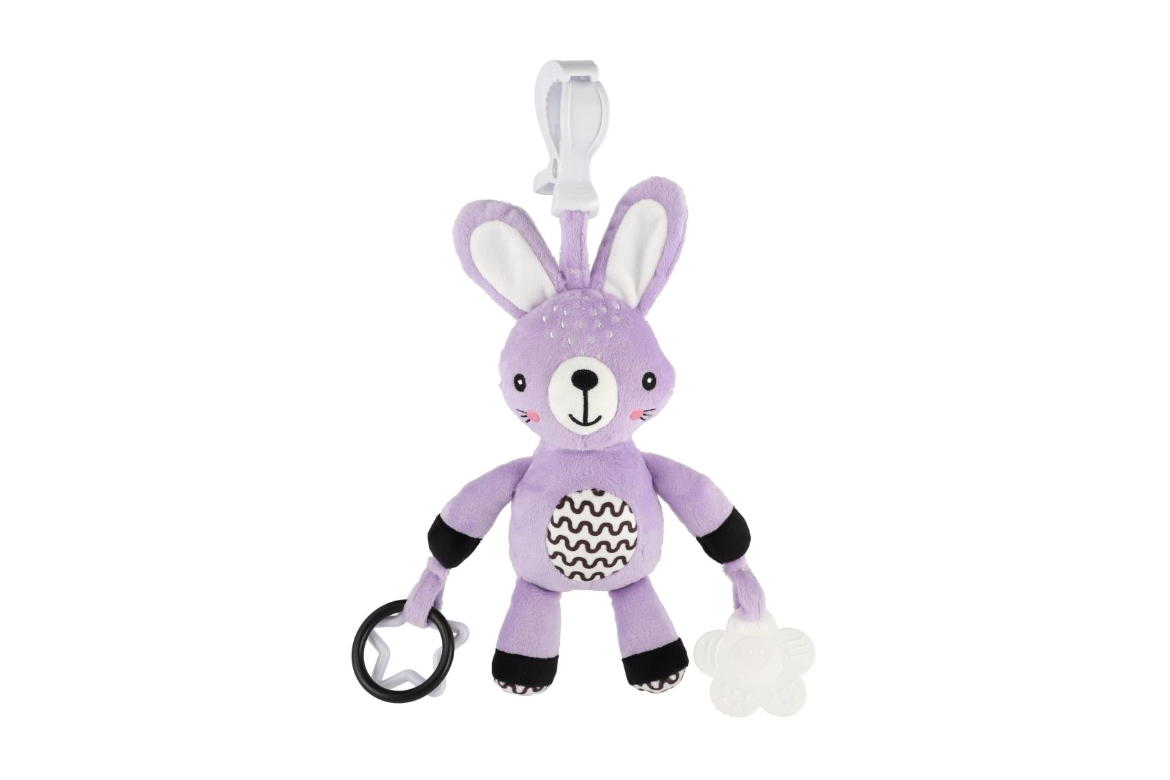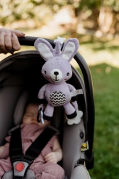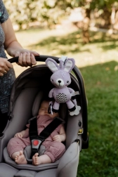 Ez a selymesen puha, felakasztható nyuszi a baba első kis barátja lesz otthon és útközben is. Az univerzális klipnek köszönhetően könnyedén rögzítheti babakocsira, autósülésre, kiságyra vagy játszóhídra. A puha plüss test ölelgetésre csábít, míg a csörgő fülek és a kontrasztos részletek támogatják a látási és hallási ingerek észlelését.