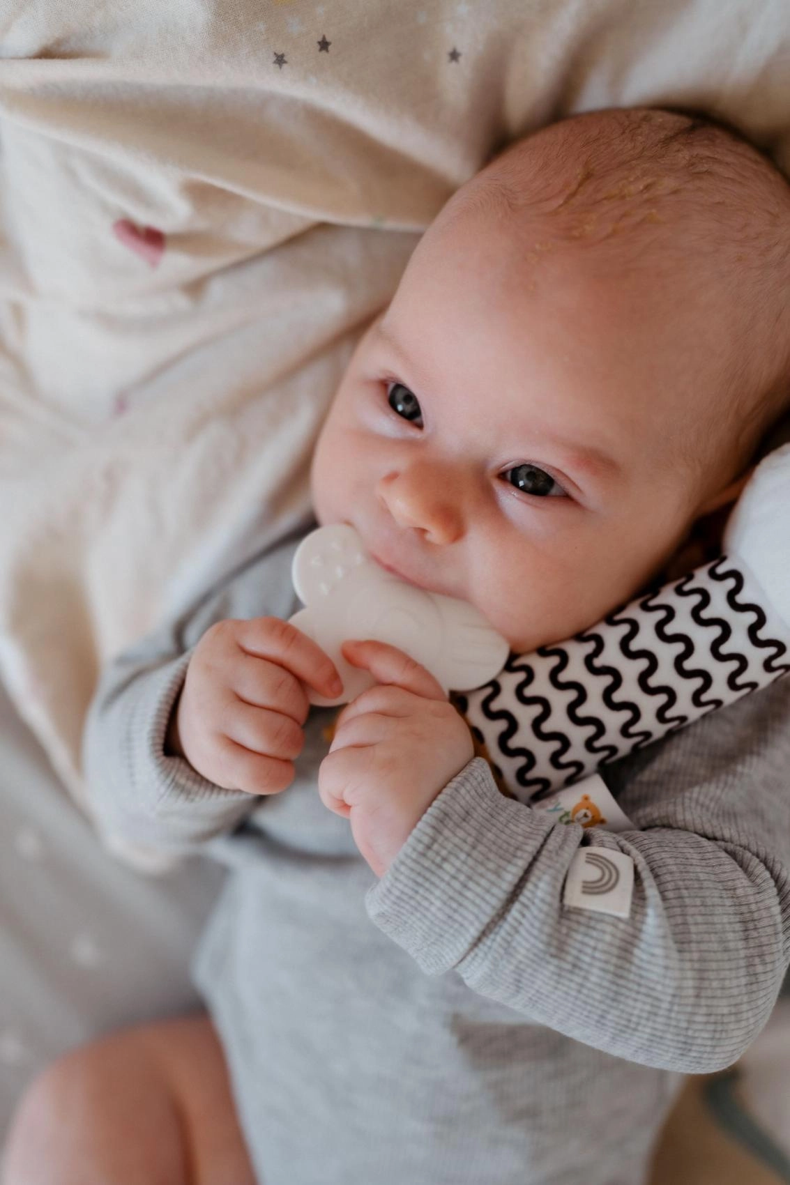 Az alsó virág alakú rágóka kíméletes az ínyhez és segít az első fogak előbújásakor. A kontrasztos fekete-fehér minta segíti a legkisebbek vizuális fejlődését. A puha, biztonságos plüss kellemes tapintású és újszülött kortól alkalmas. A termék Magyarországon tanúsított, magas biztonsági szabványoknak felel meg, és remek ajándék 0 hó+ babáknak.