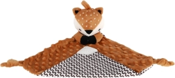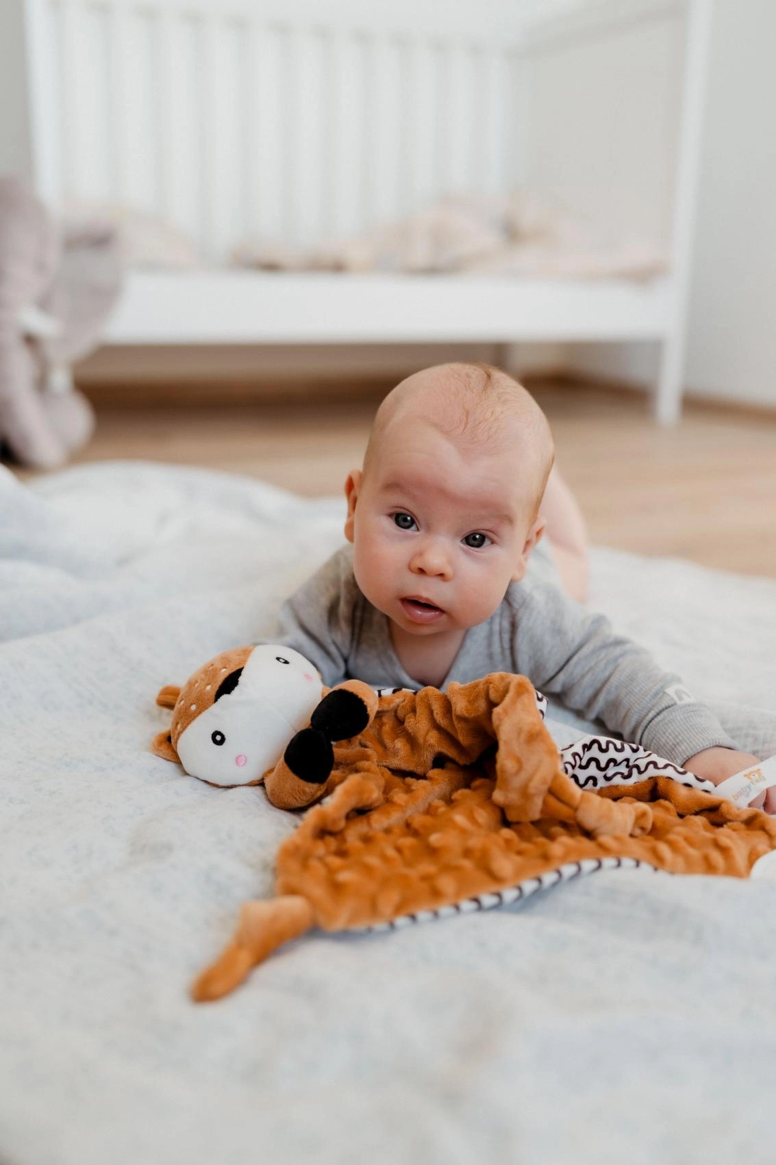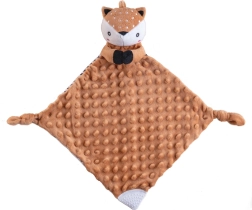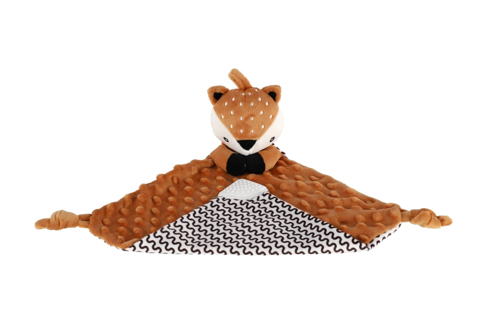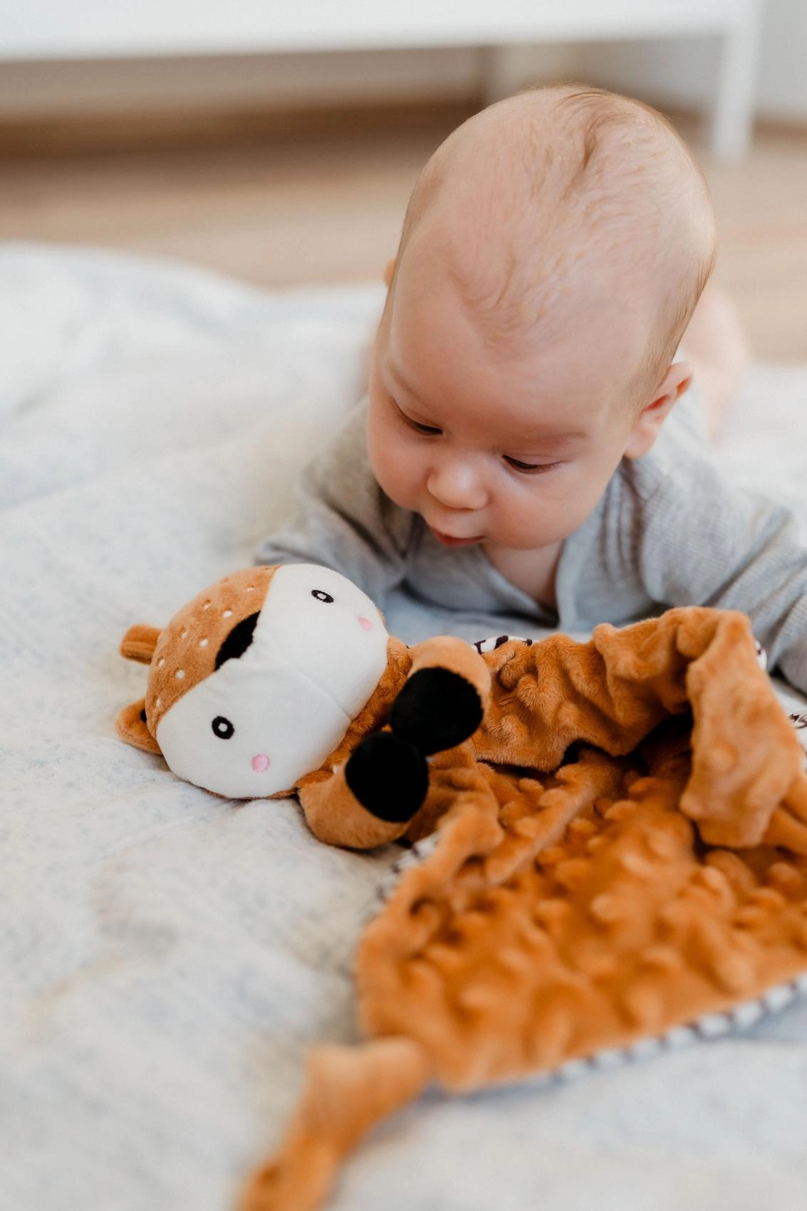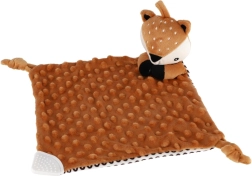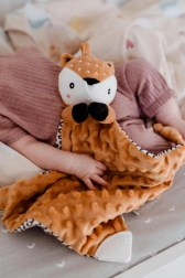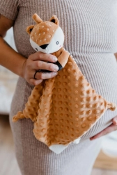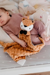 Ez a pihe-puha őzikés alvókendő ötvözi az ölelni való takarót és a kedves plüss pajtást. A kiemelkedő pöttyökkel textúrázott minky anyag gazdag taktilis stimulációt és kellemes összebújást kínál. A beépített rágóka segít a fogzásnál, a finom csörgő pedig támogatja a hangok észlelését és a koordinációt.