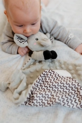 Az integrált csörgő finoman csilingel és támogatja a hallás fejlődését, míg a puha szilikon rágóka megkönnyebbülést nyújt az érzékeny ínynek az első fogak kibújásakor. Az alvókendő ideális alváshoz, babakocsiba és utazáshoz.