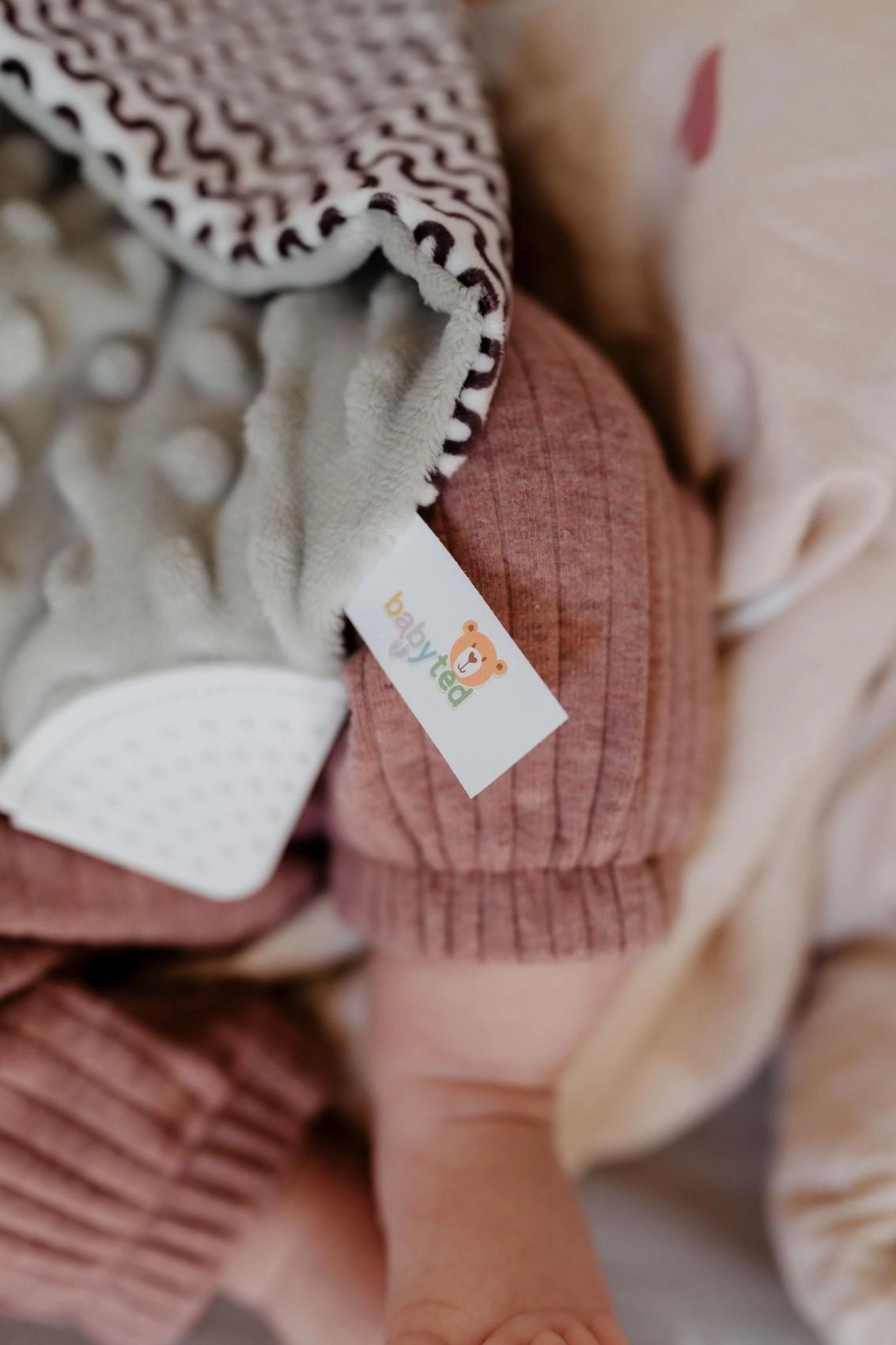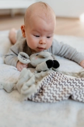 - Alvókendő / plüsskendő rágókával és csörgővel