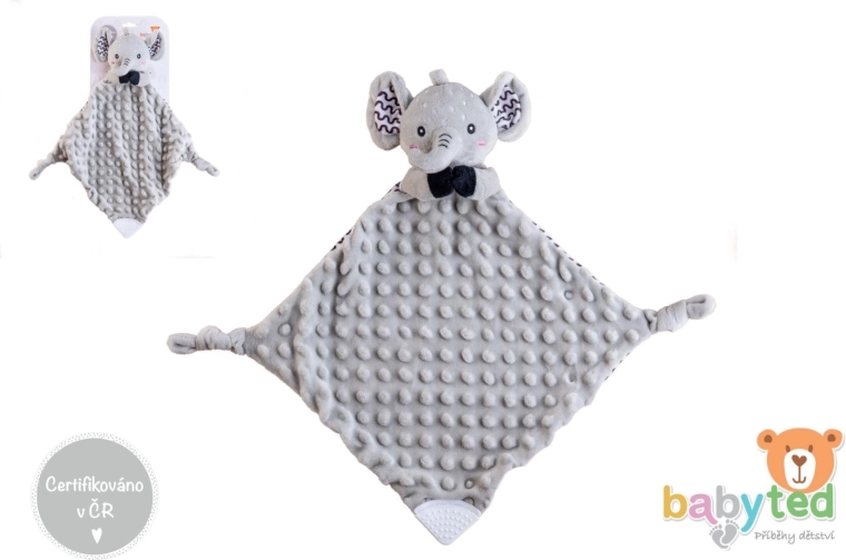 Adj megnyugtató mindennapi társat a babának. A BABYTED elefánt alvókendő rendkívül kellemes tapintású, karakteres 3D struktúrájú minkyből készült, amely stimulálja a tapintást és ölelgetésre késztet. Könnyű kialakításának és a sarkokon lévő csomóknak köszönhetően a legkisebb kezek is könnyen megfogják.