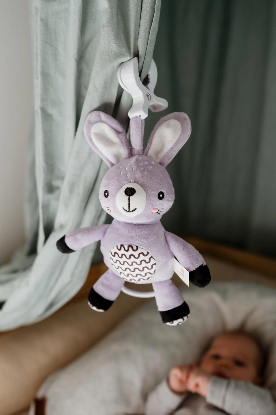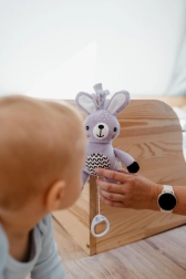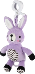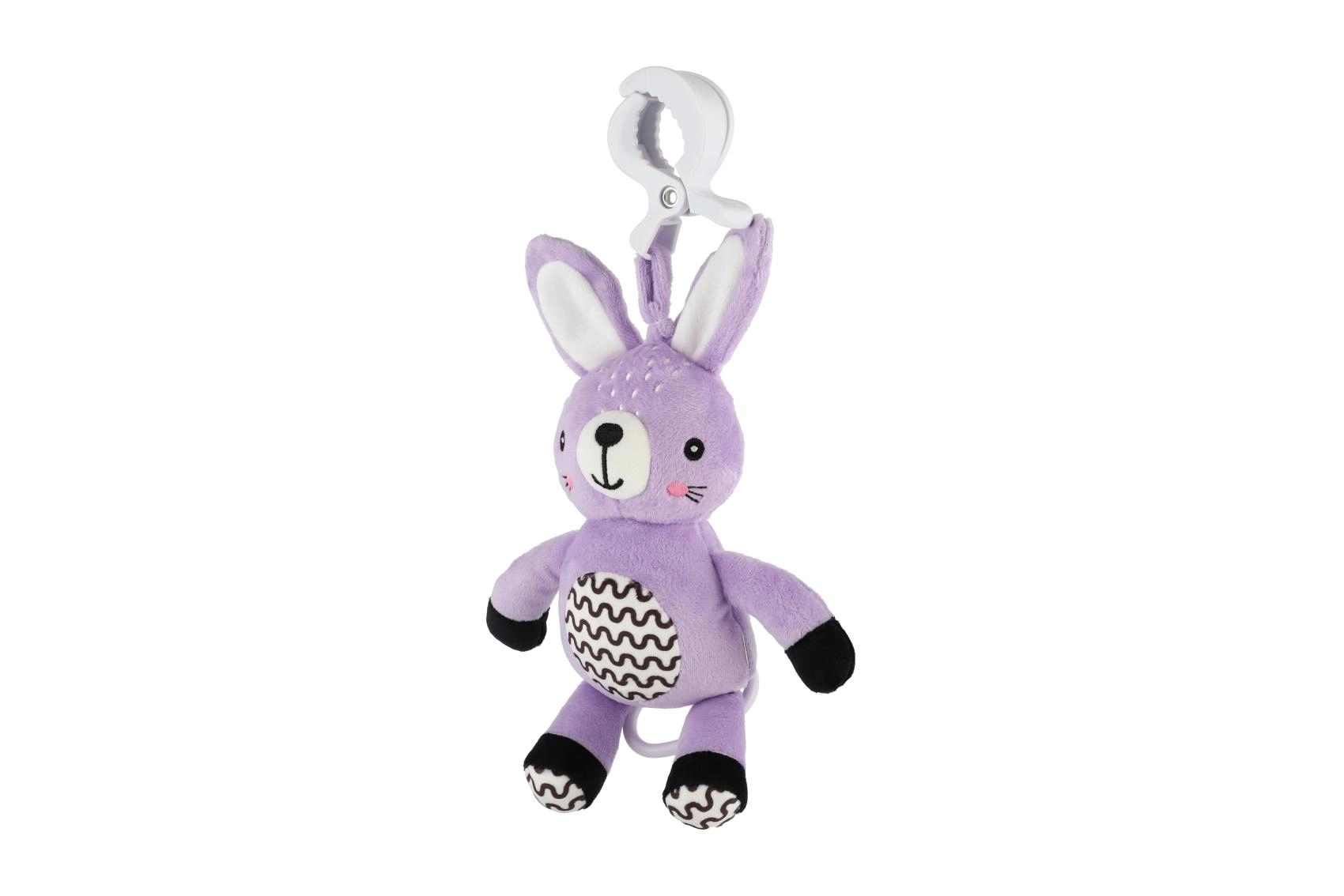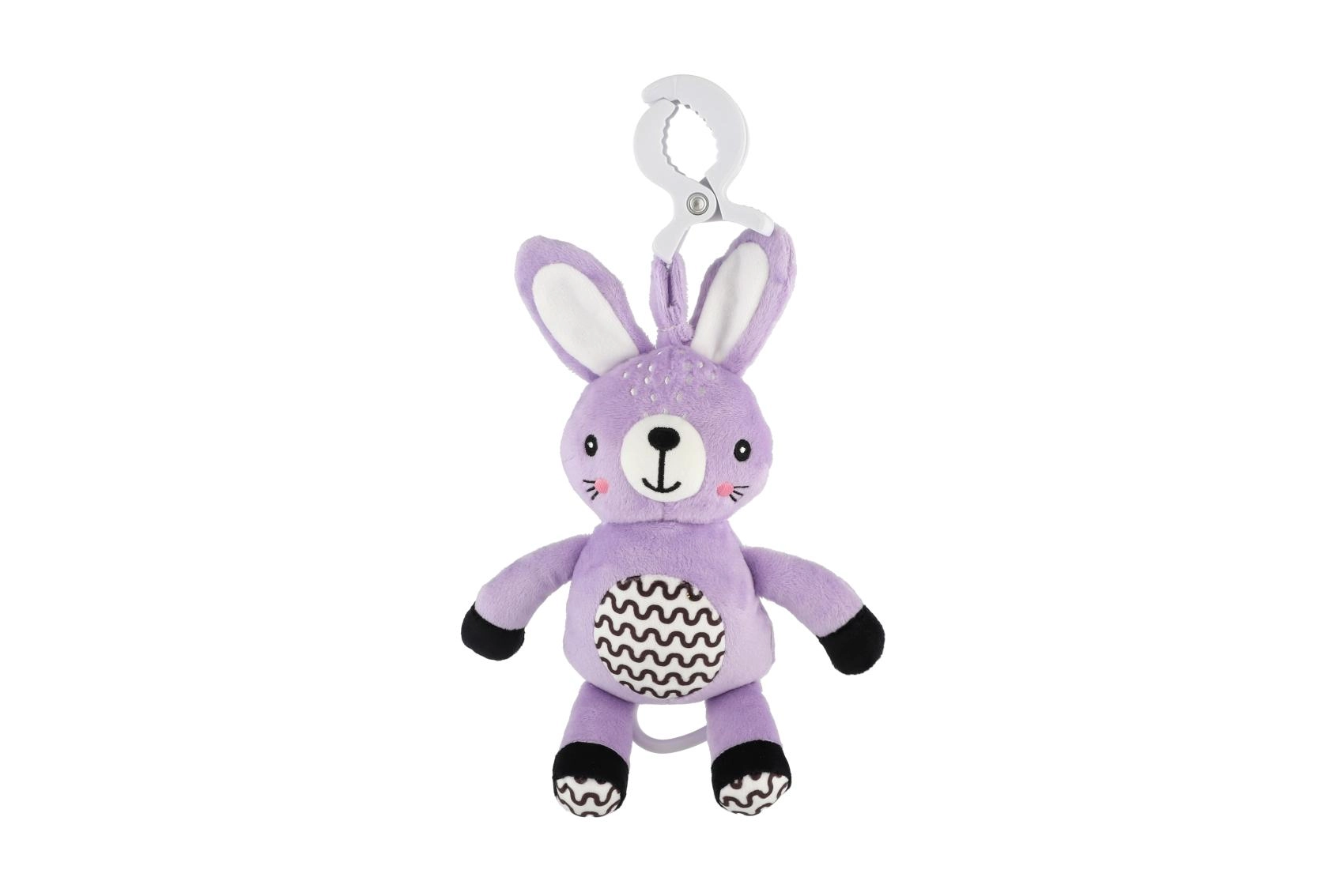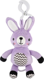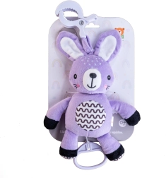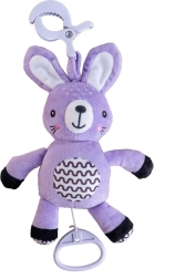 Ez a függeszthető plüss nyuszika megnyugvást, gyengéd stimulációt és biztonságos szórakozást nyújt a babának otthon és útközben. A húzható szerkezet meghúzás után kellemes dallamot játszik, amely segít nyugodt környezetet teremteni a pihenéshez. Az univerzális klipnek köszönhetően a játék könnyen rögzíthető babakocsira, kiságyra, autósülésre vagy tornabotra.