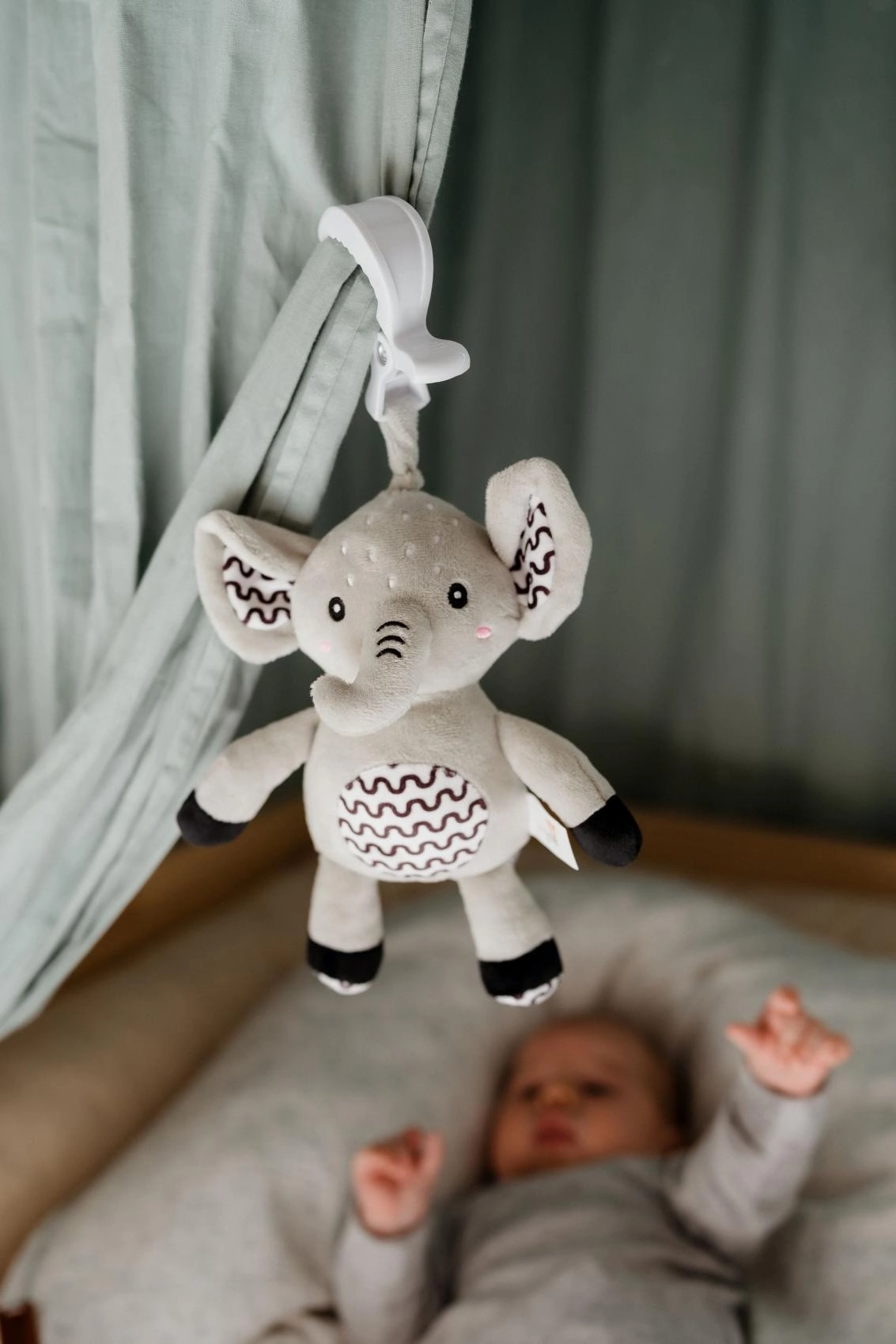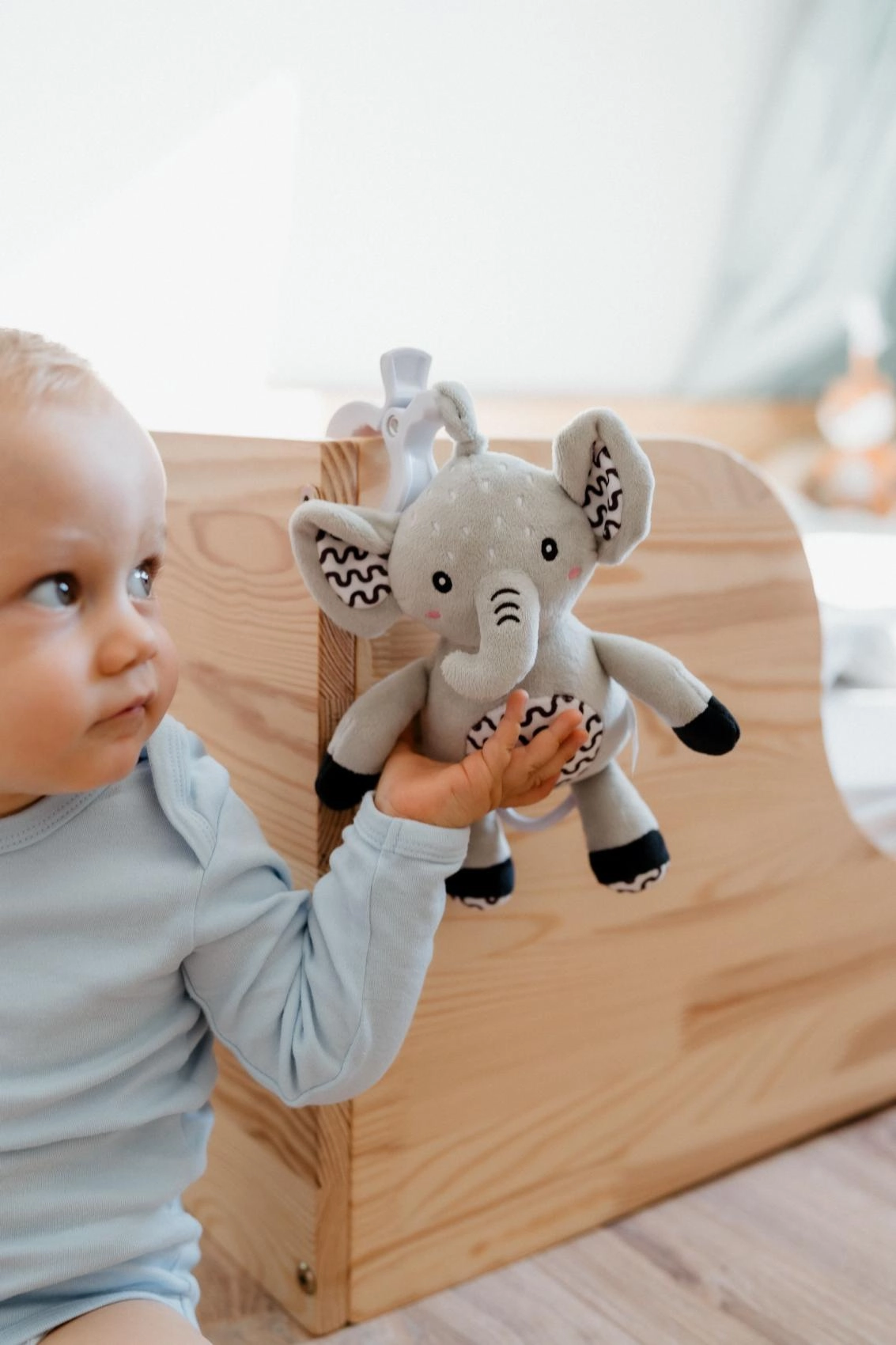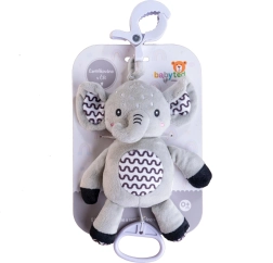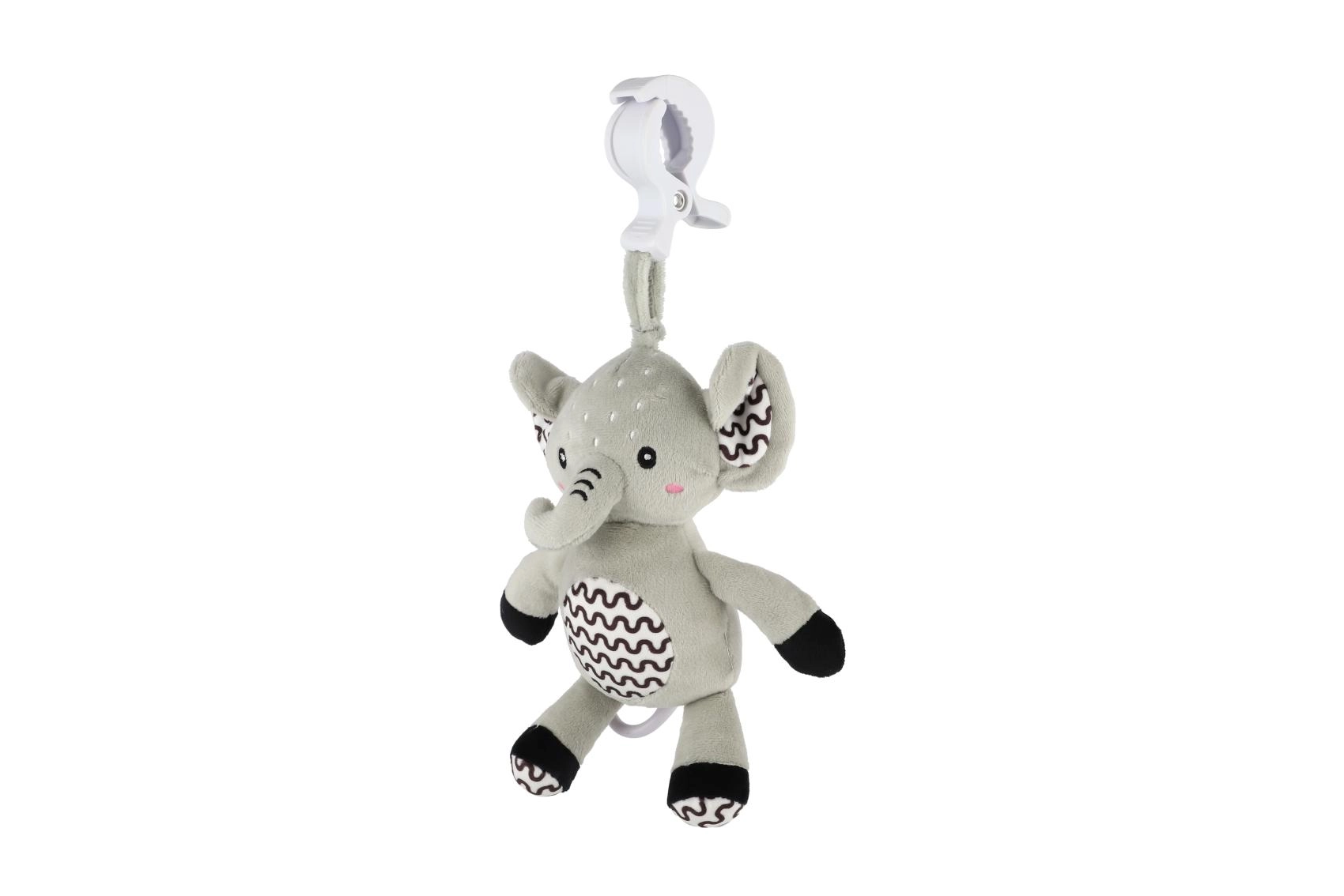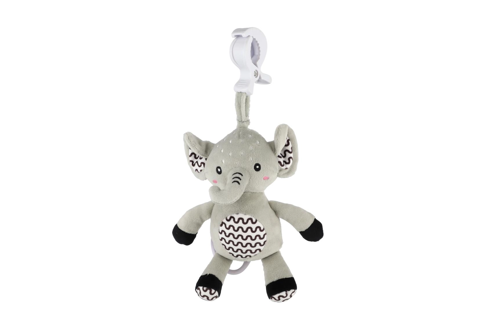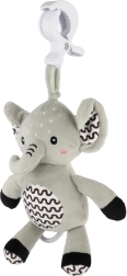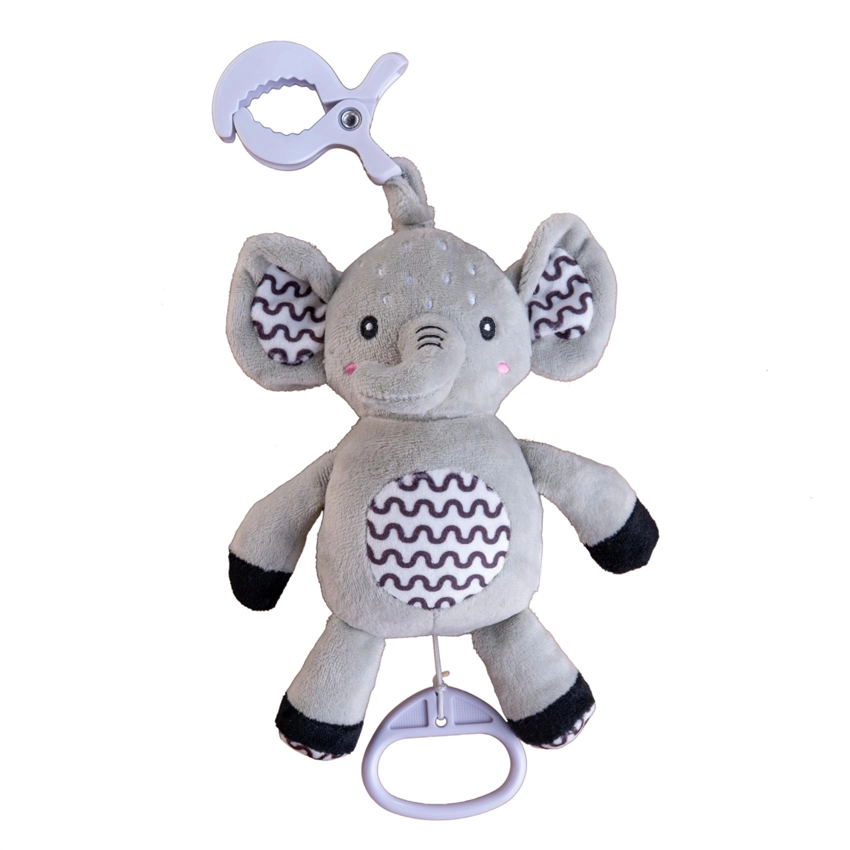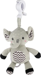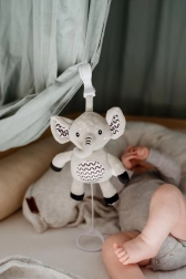 Ez a pihe-puha elefánt ideális első játék a babának. A gyűrű meghúzására lágy, megnyugtató dallam szólal meg, amely segít a megnyugvásban és a könnyebb elalvásban. A tartós függesztő klipnek köszönhetően kiságyra, babakocsira, autósülésre vagy tornapálcára is rögzíthető – így a kicsi barátja mindig vele lehet.