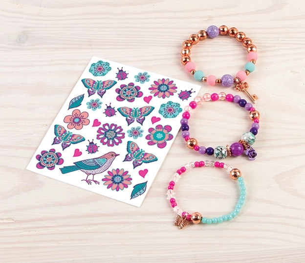 Fejleszd a kreativitásod, és tervezd meg saját virágos karkötőidet, amelyeket ideiglenes tetoválásokkal hangolhatsz össze. A színes gyöngyöknek, medáloknak és az egyszerű felfűzésnek köszönhetően pillanatok alatt olyan ékszerek készülnek, amelyek minden kis parádést megörvendeztetnek.