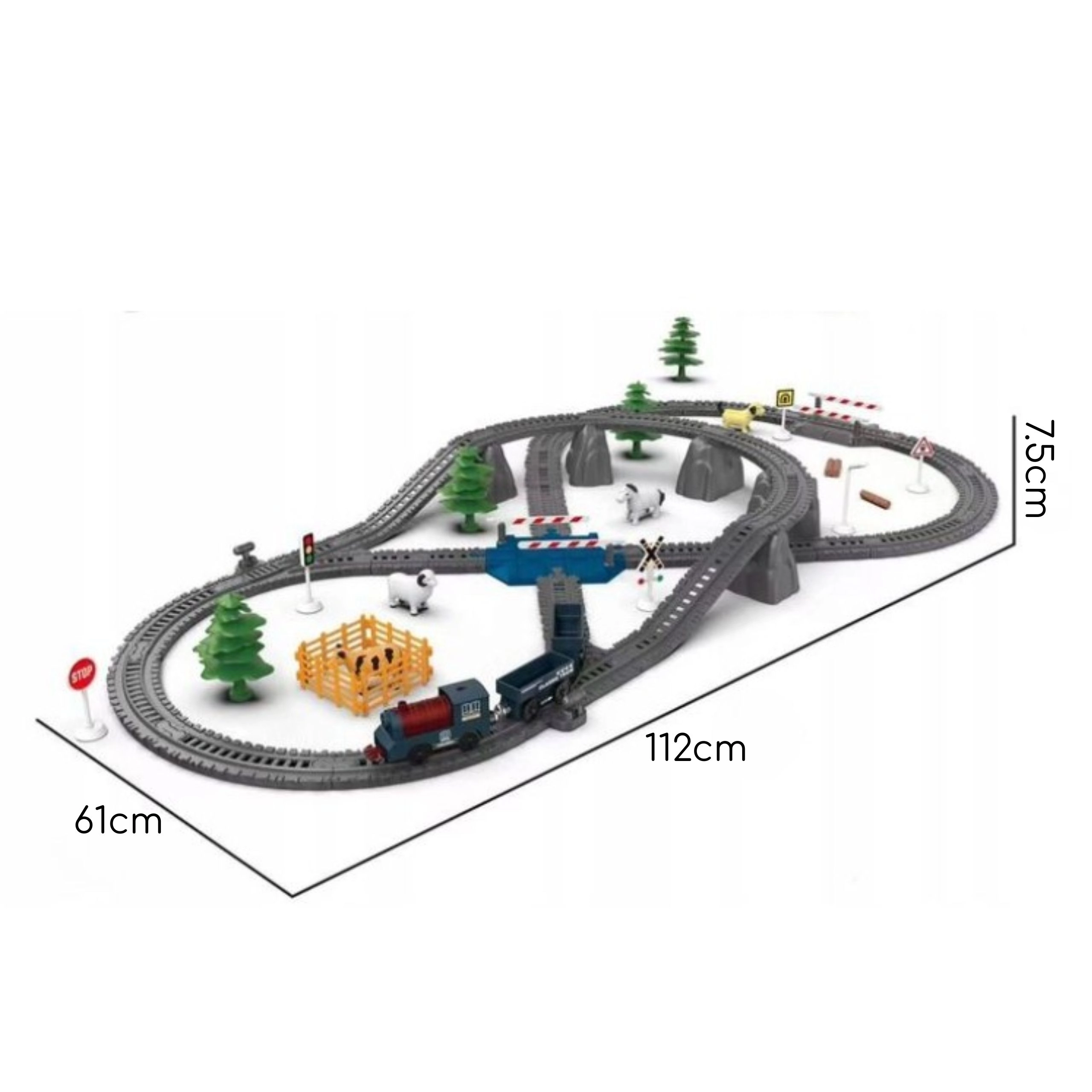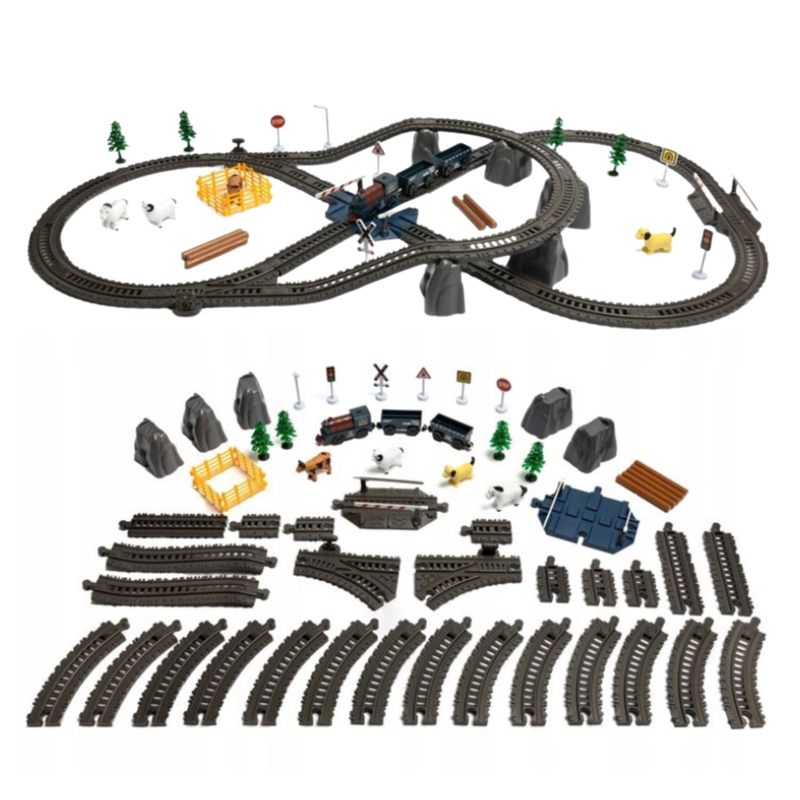 - 2 tehervagon, állatfigurák, sorompós átjáró, közlekedési táblák, fák és egyéb dekorációk