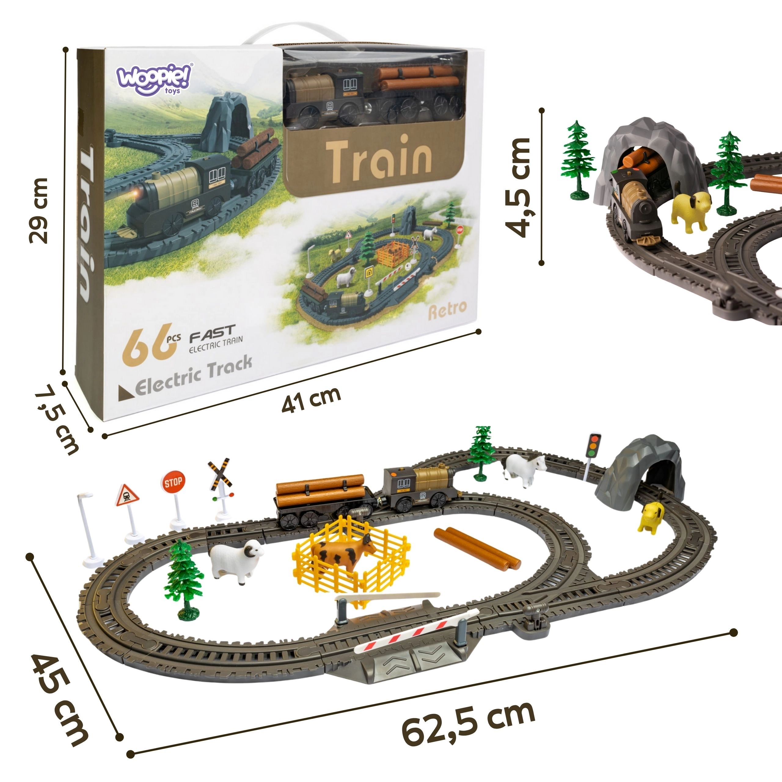 Ez a retro elektromos WOOPIE vasútpálya órákig tartó szórakozást nyújt gyerekeknek és felnőtteknek egyaránt. Az elemes mozdony előre és hátra halad, az első lámpa világít, és a színes síneken a jól átgondolt váltóknak köszönhetően simán közlekedik. A gazdag felszereltségnek köszönhetően különféle útvonalak és jelenetek építhetők – az egyszerű köröktől a kiterjedt pályákig.
