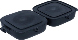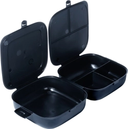 Stílusos, matt fekete lunchbox a mindennapi, otthonon kívüli étkezéshez. Két különálló tartály saját fedővel, hogy a főételt elválaszthassa a snackektől, gyümölcstől vagy salátától – így az étel pontosan olyan marad, ahogyan bepakolta. A kompakt 16 × 16 × 9 cm-es méret elfér hátizsákban és munkahelyi táskában is.