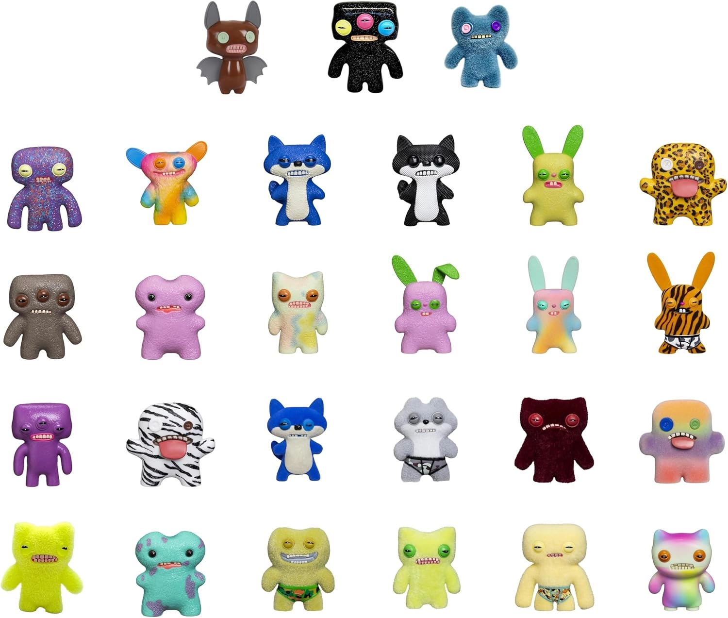 A FUGGLER készlet két véletlenszerű figurát kínál, amelyek mindegyike saját arckifejezéssel, színekkel és textúrákkal bír. Vicsorgó fogaktól a gombszemeken át a szőrös vagy műanyag felületekig – ezek a bizarr „ugly-cute” karakterek azért készültek, hogy megnevettessenek és kitűnjenek a polcon vagy az íróasztalon.