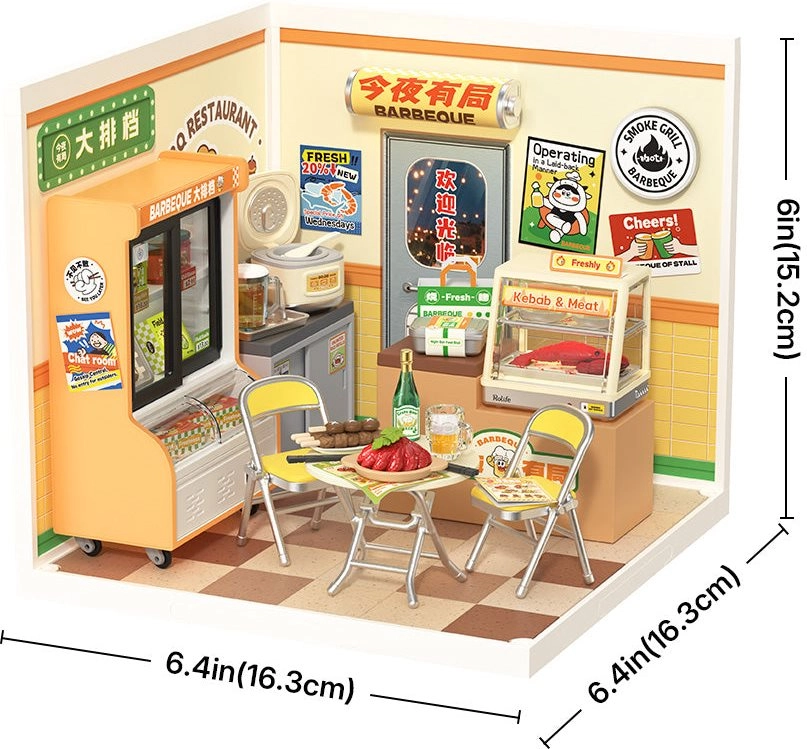 Fedezd fel az utcai gasztronómia báját egy színekben, ikonikus feliratokban és autentikus részletekben gazdag miniatűr étteremmel. Találsz benne italokkal teli hűtőt, grillpultot, rizsfőzőt és szószválasztékot – mindezt aprólékosan kidolgozva az utolsó darabig. A beépített LED világítás kiemeli az éjszakai bisztró hangulatát, és stílusos dekorációvá varázsolja a modellt.