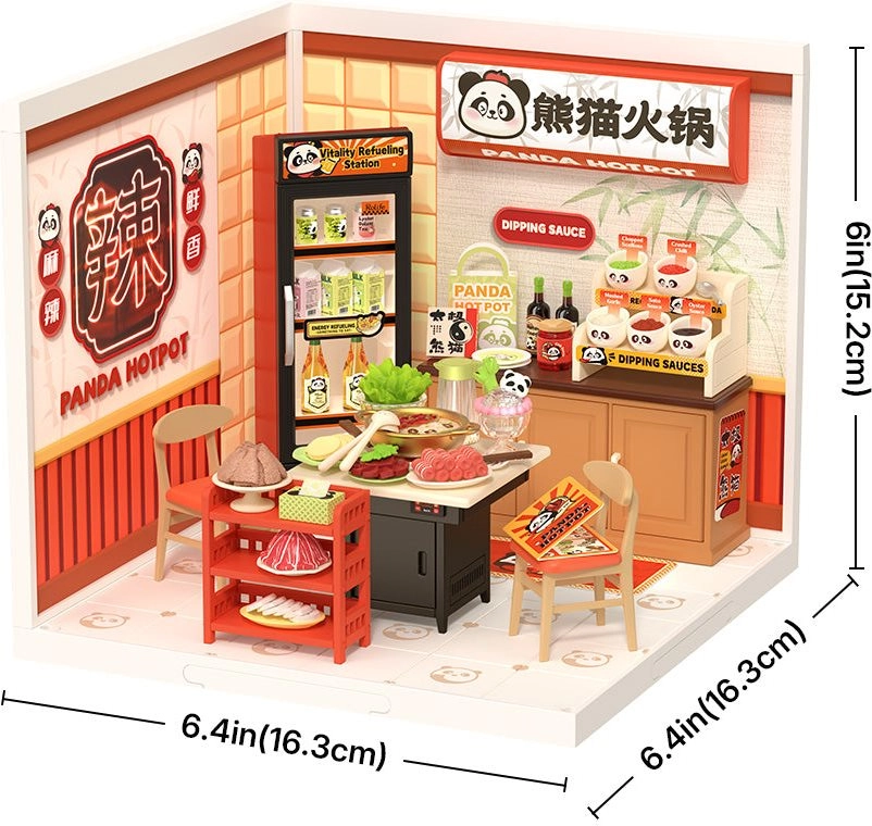 Építse meg saját Ázsiáját a Robotime Rolife éttermi miniatűrével. Ez a DIY házikó LED világítást, élethű hot pot konyharészletet, teljesen feltöltött hűtőszekrényt és gazdag szószállomást kínál. A 1/5-ös alacsony nehézségi szintnek köszönhetően ideális kezdőknek és pihentető projektnek, a kész modell pedig kompakt méreteivel stílusos dísz lehet.