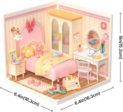 Ez a gyönyörű, pasztell tónusú mini hálószoba mindent kínál, amit a miniatúrák szerelmesei értékelnek: ágy textíliákkal, tükrös fésülködőasztal, éjjeliszekrény, beépített szekrény és sok apró kiegészítő. A meleg LED világítás kellemes hangulatot teremt, és kiemeli a bútorok és dekorációk részletgazdag kidolgozását.
