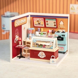 Teremts varázslatos hangulatot egy retro fagyiszalonban. A készlet mindent tartalmaz egy részletgazdag miniatűr üzlet összeállításához világító felirattal, átlátszó pulttal fagylalttégelyekkel, színes szirupokkal és öntetekkel, valamint forgott fagylalt géppel. A pasztell színek, rózsaszín falak és a dekoratív díszlécek autentikus megjelenést kölcsönöznek.