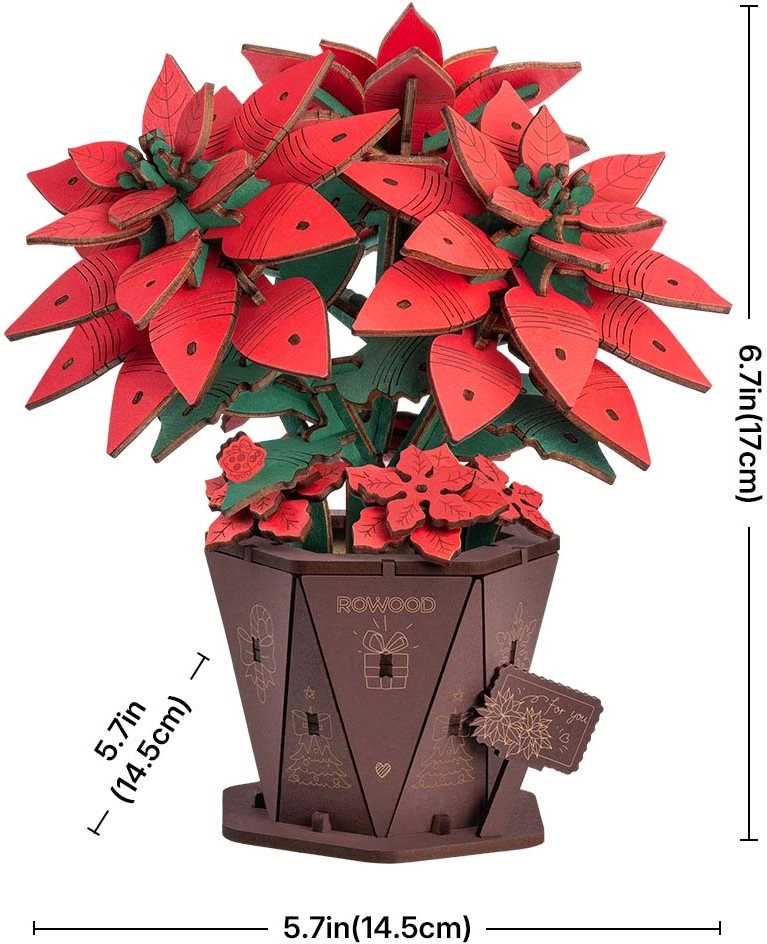 Ez az elegáns, cserépbe ültetett 3D fa karácsonyi csillag lézervágott, számozott elemekből áll a gyors és intuitív összeszereléshez. Masszív felépítése révén jól tartja a formáját, és összeállítás után valósághű levelekkel és szirmokkal látványos ünnepi díszt alkot.