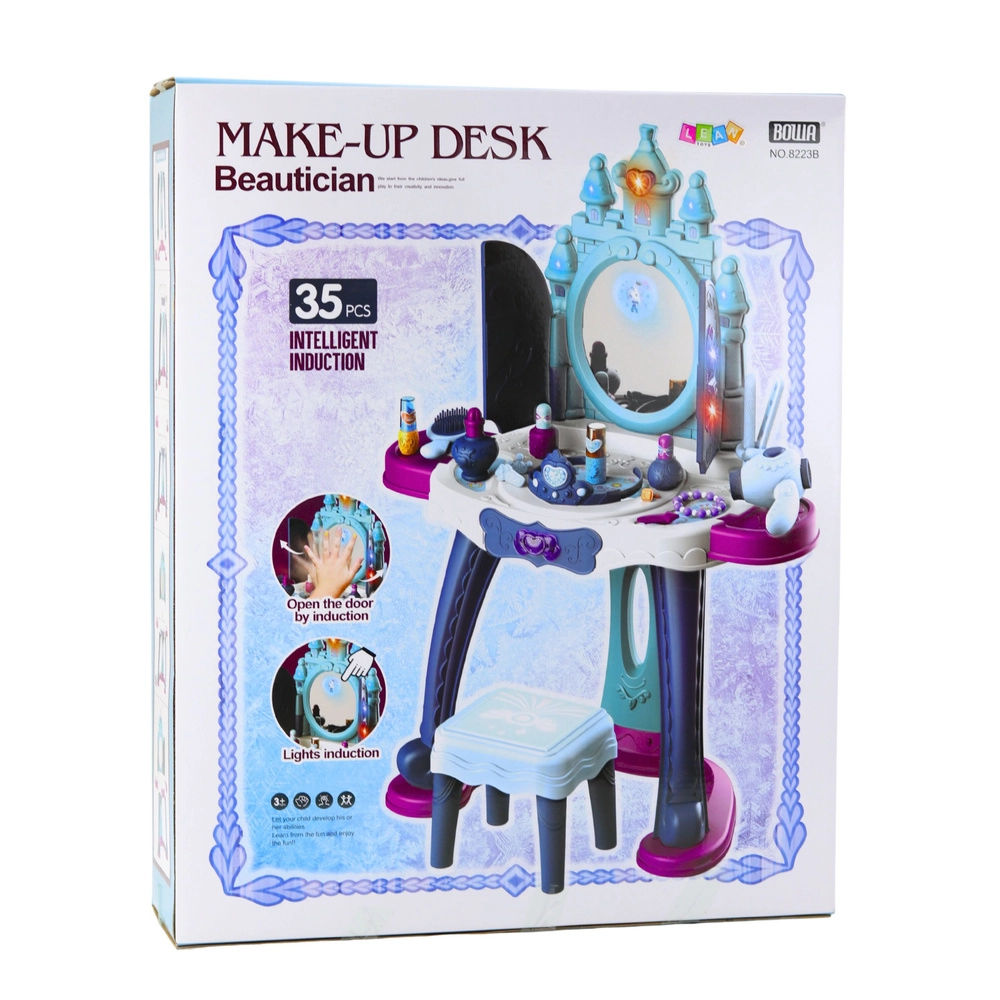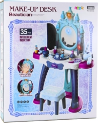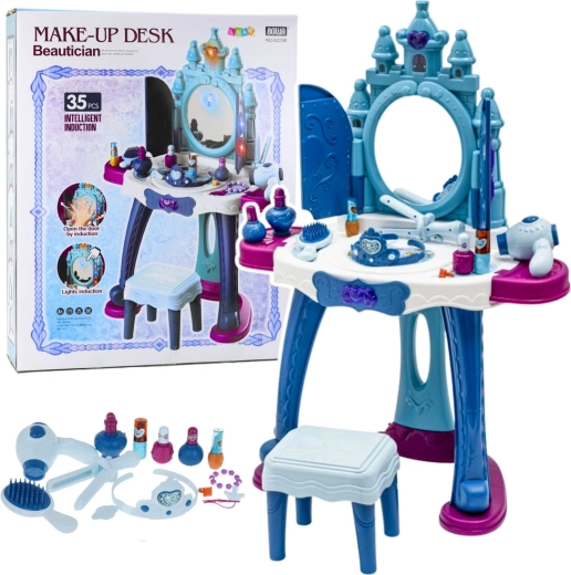 Varázslatos, interaktív gyerek fésülködőasztal, amely hercegnős birodalommá változtatja a szobát. Kínál fényhatásokat, varázslatos dallamokat, nyitható ajtócskákat tükörrel és hercegnők megjelenítésével. A csomag része egy szék és egy gazdag 35 darabos kiegészítő készlet a kreatív játékhoz – a kefétől és hajszárítótól az ékszerekig és a „kozmetikumokig”. Masszív és biztonságos, tartós műanyag szerkezet, ideális a kis stylistoknak.