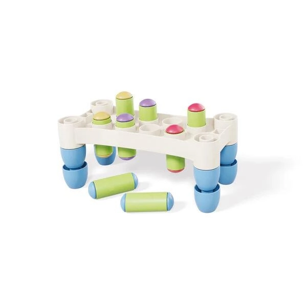 Ez a tartós, újrahasznosított műanyagból készült ütögetős játék végtelen, értelmes szórakozást nyújt. A gyerekek kalapáccsal ütik be a színes csapokat a lyukakkal ellátott alapba, miközben természetes módon gyakorolják a fogást, az ütés erejét és a pontosságot. Amint minden csap a helyére került, elég megfordítani a játékot és folytatni – ideális a koncentráció és a türelem fejlesztéséhez.