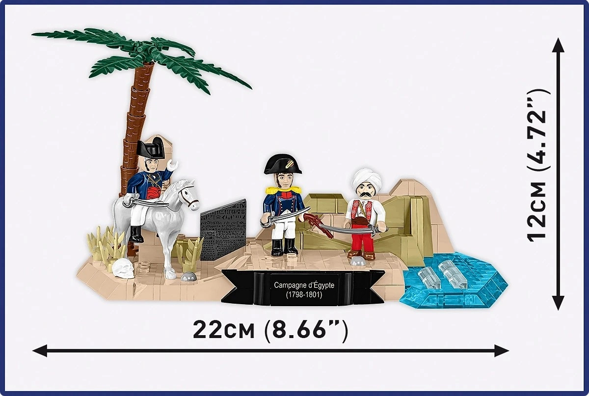 Fedezd fel Napóleon izgalmas történetét a Nílusnál. A Napoleonic Wars sorozat COBI készletei történelmi hangulatot hoznak gyűjtői dioráma formájában: pálmafa, a nílusi táj egy szakasza és a Rosette-i kő egyedi modellje tartós nyomattal. Nem hiányoznak a karizmatikus szereplők sem – Jean‑Baptiste Kléber tábornok, Pierre‑François Bouchard hadnagy és a hagyományos szablyát viselő mameluk.