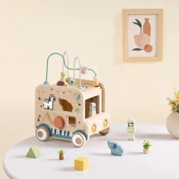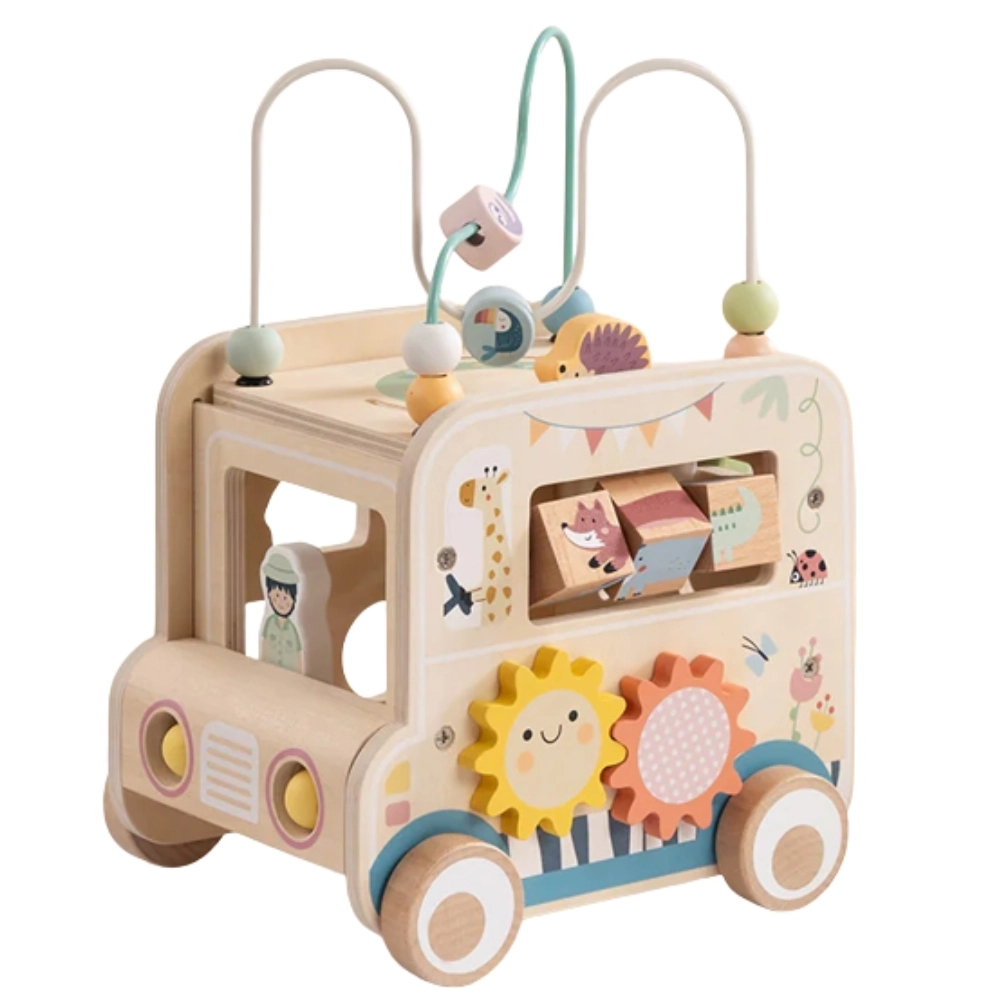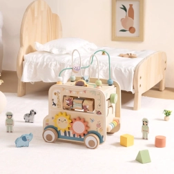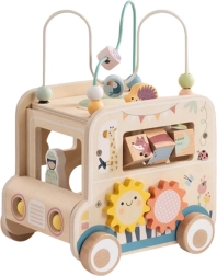A fa aktív kocka/szafari autó számtalan felfedeznivalót kínál. A levehető motorikus huzalozott pályától a gyöngyökkel, a labirintuson és a fogaskerekeken át egészen az állatos forgó blokkokig – minden oldal új kihívást tartogat. A finom színek és a sima kidolgozás biztonságos játékot és készségfejlesztést támogat.