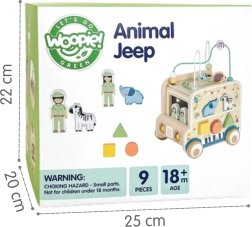 Fedezd fel a játékos világot a WOOPIE GREEN márka safari autó formájú, fa aktív kockájával. Ez a multifunkciós játék ötvözi a motorikus golyóvezetőt, az alakválogatót, a forgó fogaskerekeket és a képes blokkokat, hogy támogassa a finommotorikát, a koordinációt és a kreatív játékot 18 hónapos kortól.