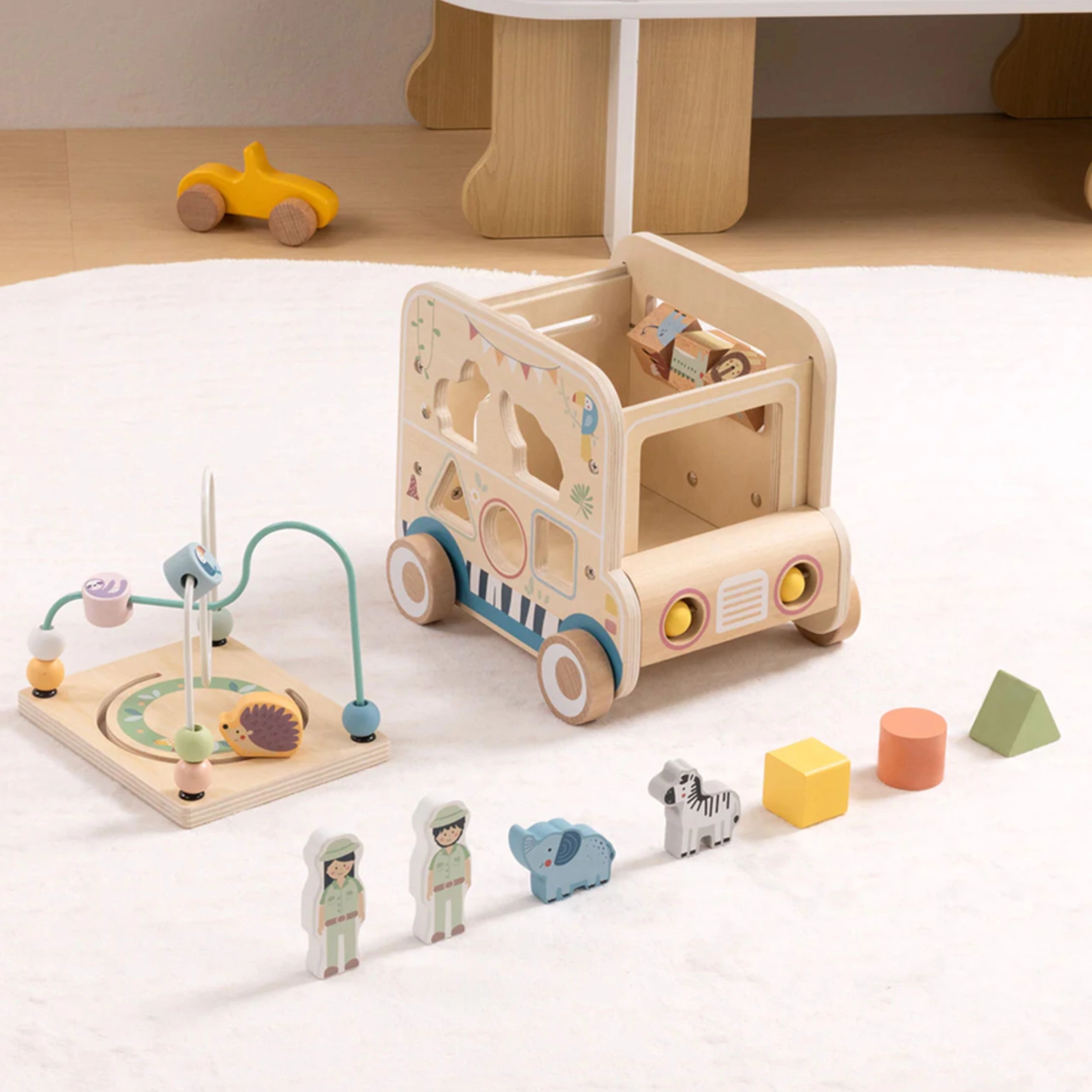 - levehető huzalozott pálya, labirintus, 2 fogaskerék, fa gyöngyök, forgó állatos kockák, 3 alak a válogatóhoz, 2 állatfigura, 2 szafari kísérő figura