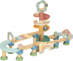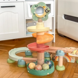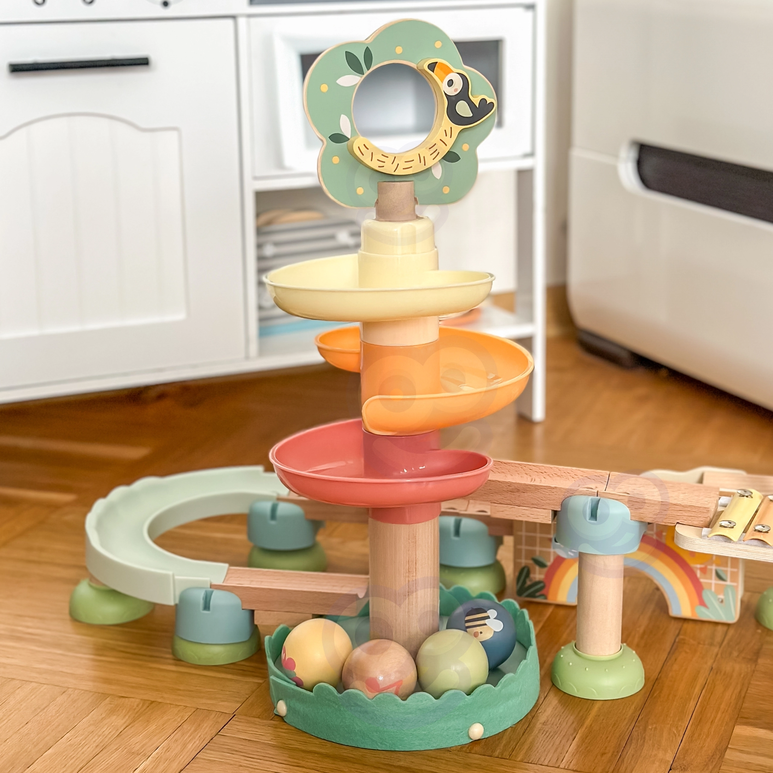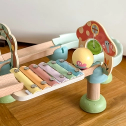 Ez a minőségi golyópálya ötvözi a mozgást, a hangot és a kíváncsi felfedezést. A gyerekek figyelik, ahogy a golyók a kanyarokon legurulnak, hidakon áthaladnak, és megszólaltatják a xilofonos zenei részt, ami fejleszti a ritmusérzéket, a koncentrációt és örömteli játékot kínál. A finom pasztell árnyalatok és a természet motívumai nyugodt hangulatot teremtenek, és remekül illenek bármely gyerekszobába.