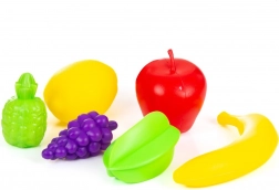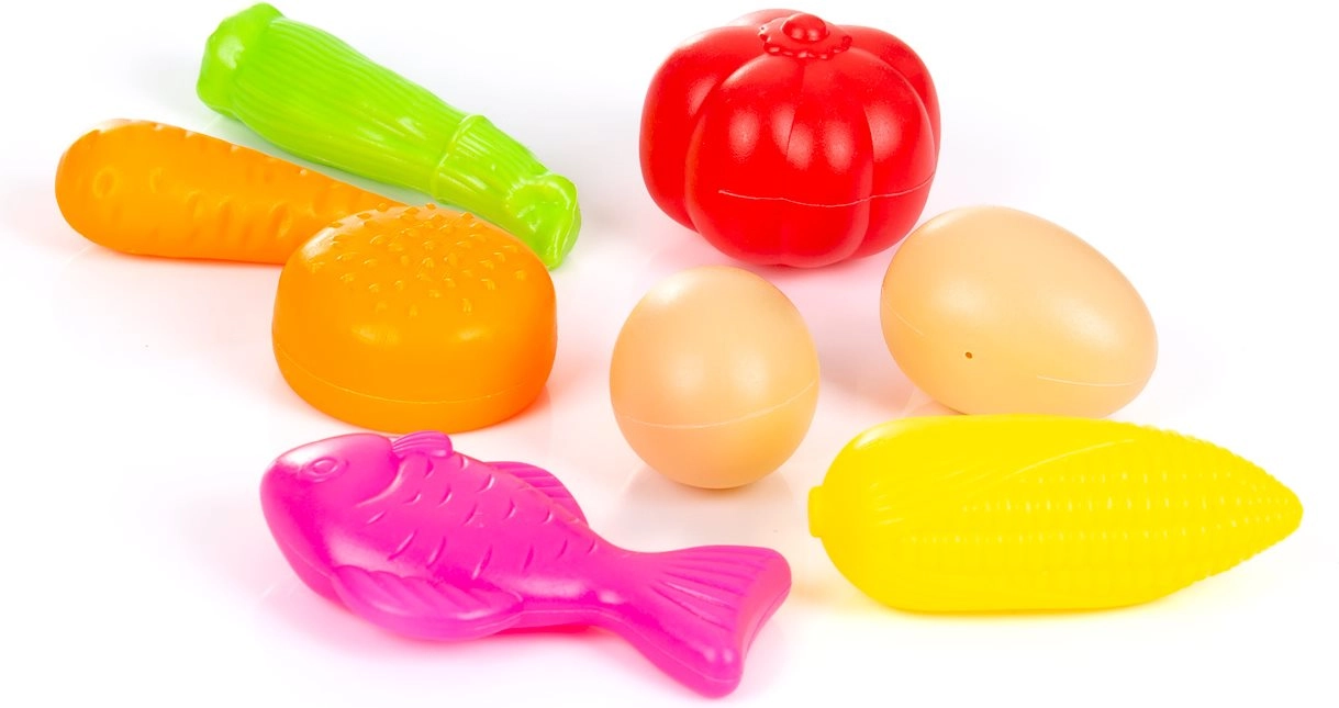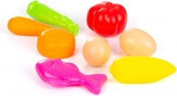 A készlet élethű gyümölcs- és zöldségmaketteket tartalmaz élénk színekben, amelyek segítik az alakok felismerését és támogatják a kreatív szerepjátékot.