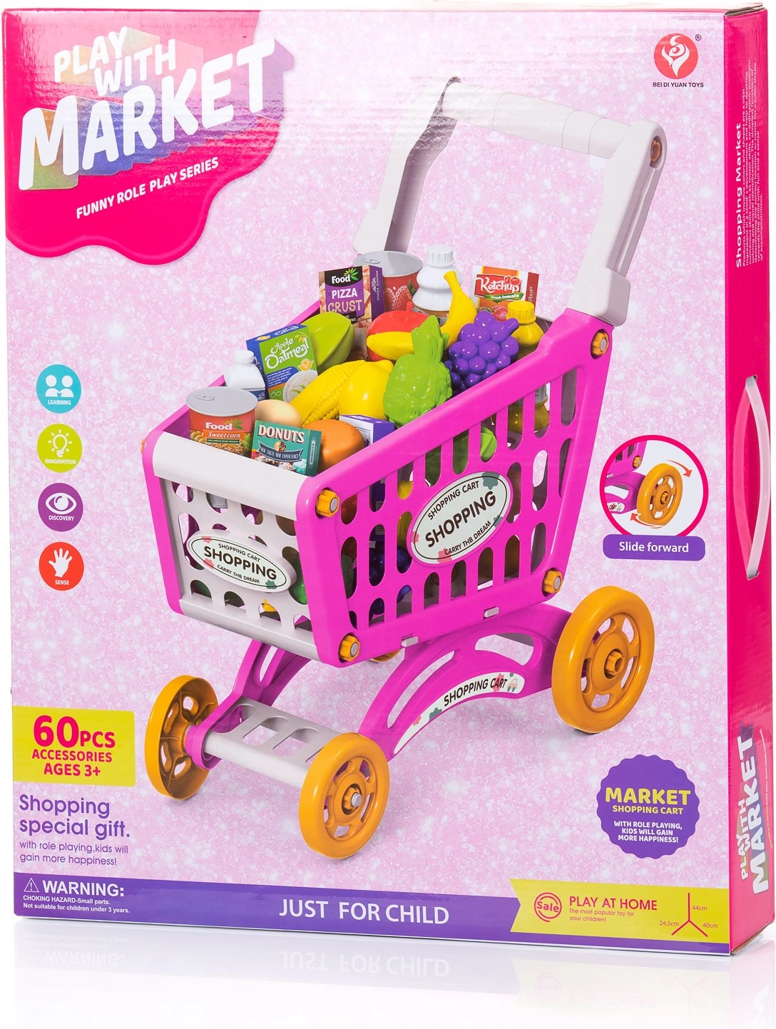 Könnyű műanyag kocsi kényelmes fogantyúval és forgó kerekekkel, ideális a kis kezek számára. A nyitott kosár könnyedén elfér benne minden gyerekvásárlás.