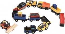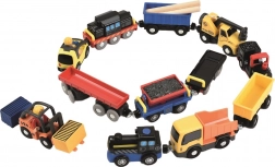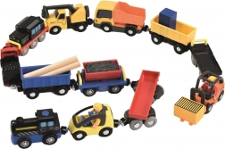 Ez a sokoldalú készlet bármely gyerek vasútjátékrendszerét bővíti mozdonnyal, vagonokkal és munkagépekkel. Az elemek mágneses kapcsolókkal könnyen összekapcsolhatók, és simán gurulnak sík felületen és kompatibilis síneken. A valósághű részletek, mint a rönk- és szénrakodás vagy az autószállítás, kreatív történetmesélő játékra inspirálnak.