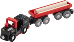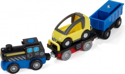 A mozdony szén- és rönkszállító kocsival a vasút világába repíti a gyerekeket. A vagonok le- és felkapcsolása fejleszti a finommotorikát és a fantáziadús játékot.