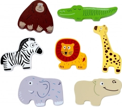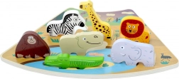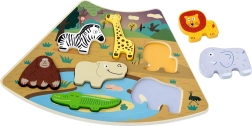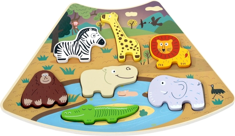 A Fa puzzle Safari ideális játék az első kirakásokhoz. A színes és aranyos állatfigurák – zebra, zsiráf, oroszlán, gorilla/orángután, víziló, elefánt és krokodil – vastag, könnyen megfogható formákkal készültek, megkönnyítve a kezelést. A szavannát ábrázoló alaplap segíti a térbeli tájékozódást és az alakfelismerést, mivel minden elemnek megvan a pontos helye.