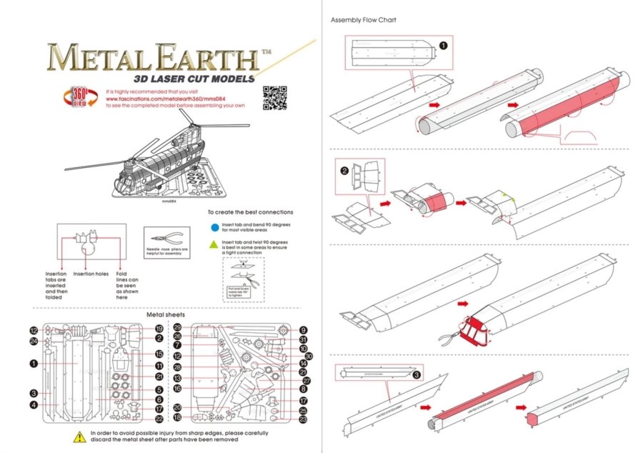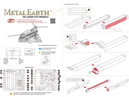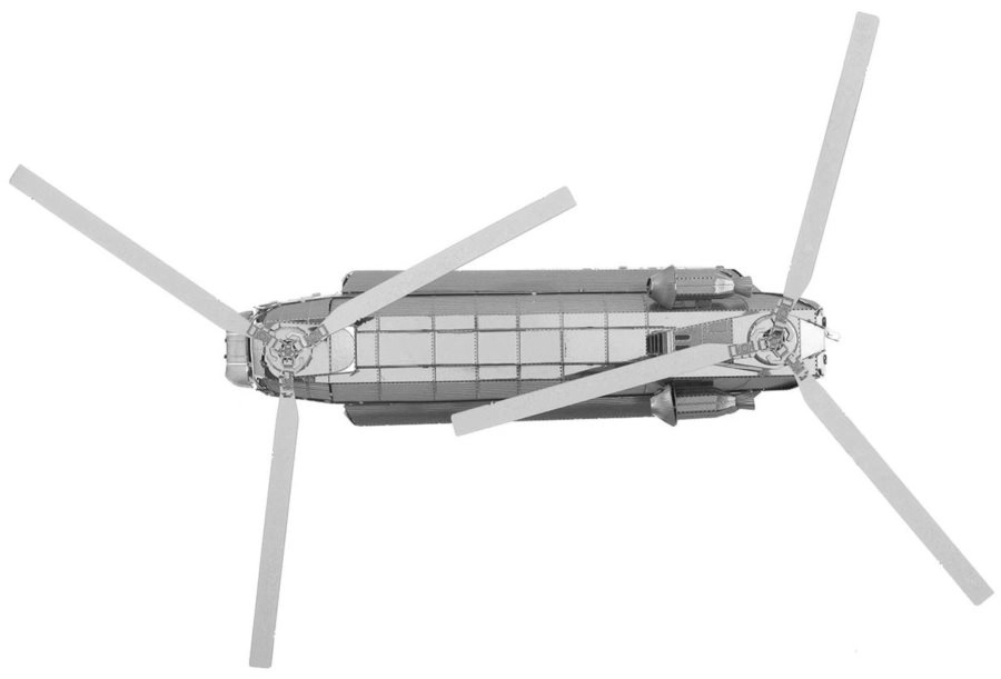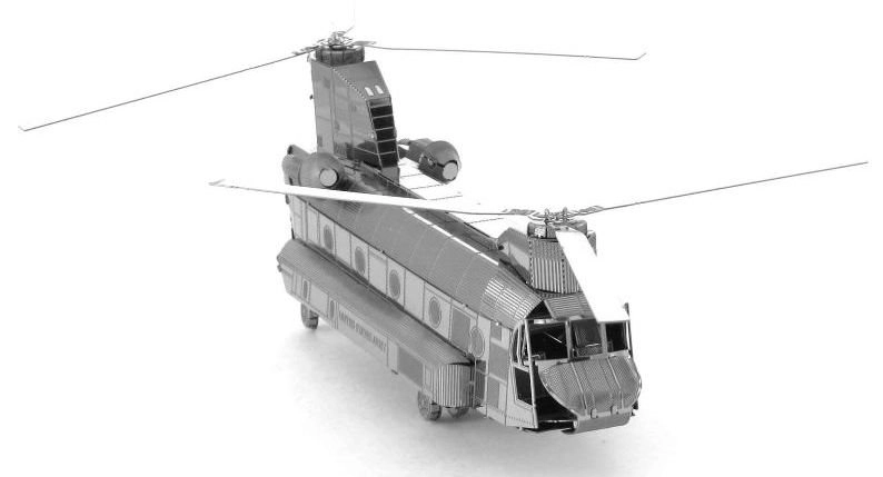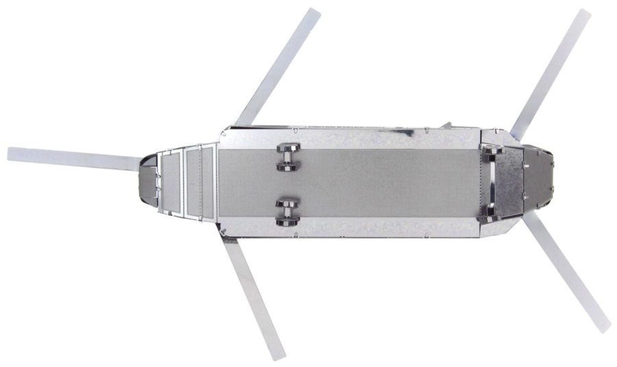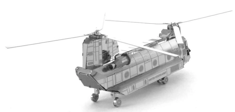 A METAL EARTH sorozat modellje 11 × 11 cm-es acéllemezekből áll, precízen kivágott alkatrészekkel. A lézergravírozásnak köszönhetően a felület élethű részletekben gazdag, a panelvonalaktól a kabinablakokig és a CH-47 CHINOOK-ra jellemző tandem rotorokig.