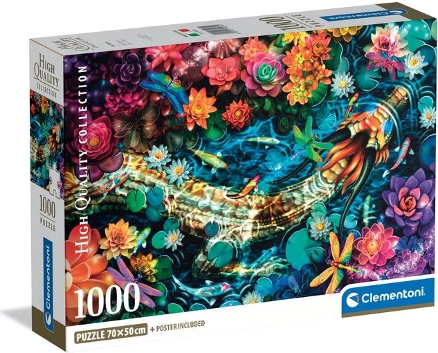 Élvezze a pihenést a CLEMENTONI minőségi kirakójával koi-tó motívummal. A pontos vágásnak köszönhetően a darabok tökéletesen illeszkednek, sima felületű képet alkotva gazdag részletekkel és élénk színekkel. Ideális nyugodt estékhez és közös kirakózáshoz a családdal.