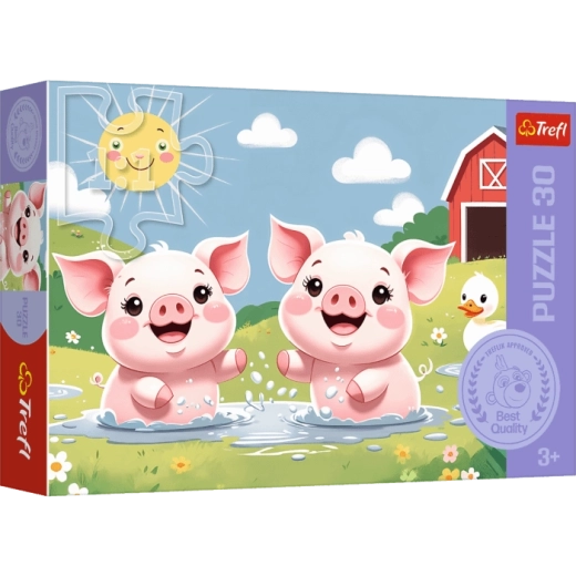 A Trefl gyerekpuzzle „Vidám élet a vidéken” motívummal 30 darabból áll, amelyeket összeillesztve egy 270 × 200 mm-es képet kapunk két malackával. A minőségi anyagoknak, a könnyű kirakásnak és a Lengyelországban folytatott környezetbarát gyártásnak köszönhetően ideális választás 3 éves kortól, fejleszti a finommotorikát és a képzelőerőt.