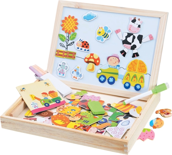Fedezd fel a vidéki hangulat varázsát egy kreatív készlettel a kis alkotóknak! Ez a kétoldalas mágneses tábla lehetővé teszi a filctollal való írást a fehér oldalon és a krétával való rajzolást a pala oldalon. A gyerekek színes, farmás témájú mágneseket rögzíthetnek, történeteket rakhatnak össze, tanulhatják a formákat és színeket, miközben fejlődik a finommotorikájuk és a képzelőerejük. Minden egy praktikus fa dobozban kapott helyet az egyszerű hordozhatóságért.