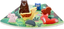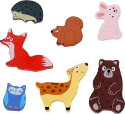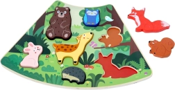 Ez a minőségi, erdei állatokkal díszített fa puzzle a 18 hónapos kortól ajánlott legkisebb felfedezőknek készült. A robusztus alap és a vastag elemek – róka, medve, szarvas, bagoly, nyúl, sün és mókus – kifejezetten a kisgyermekek könnyű megfogására lettek tervezve. A színes illusztrációk segítik az alak- és állatfelismerést, és természetes módon vezetik be a játékos tanulást.