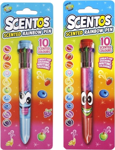 A SCENTOS illatos, szivárványos golyóstoll szórakoztató és praktikus írószer iskolába és otthonra. Egy tolltestben 10 ragyogó színt kínál, amelyek a gombok segítségével könnyen kiválaszthatók. Minden színnek megvan a jellegzetes gyümölcsös illata (pl. eper, banán, alma), ami új érzékszervi élményt ad az írásnak és a rajzolásnak.