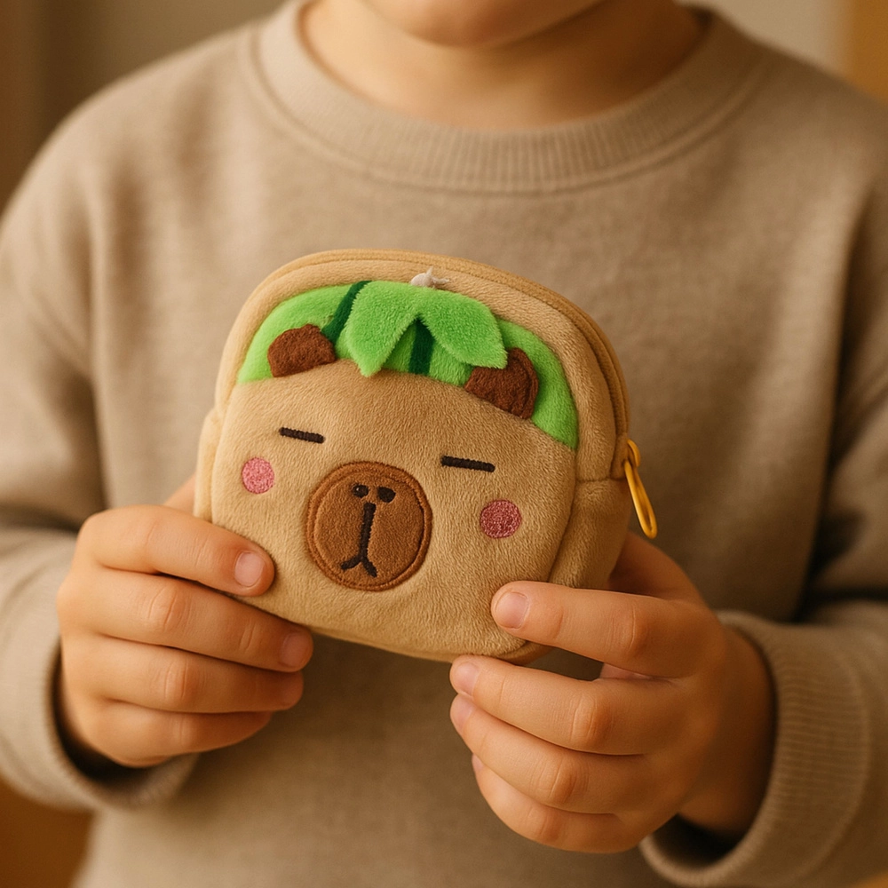 Cuki és praktikus mini pénztárca kapibara formában zöld görögdinnyés mintával. A puha plüss kellemes tapintású, a cipzáras záródás biztonságosan tartja az apróságokat, a műanyag klip pedig lehetővé teszi, hogy hátizsákra vagy kulcsokra csíptesd. A kompakt 9,5 × 8 cm-es méret elfér zsebben, táskában vagy iskolai hátizsákban.