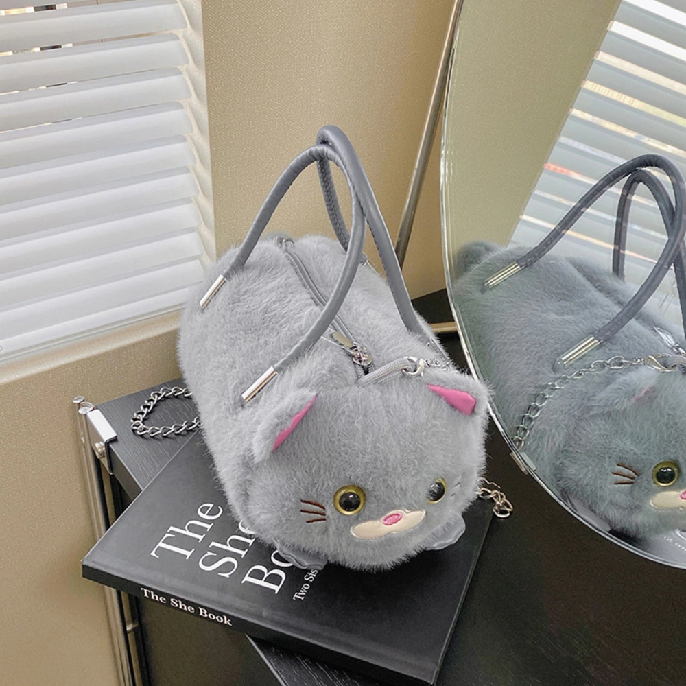 Ez a plüss, macska alakú táska első pillantásra magára vonja a figyelmet puha felületével és aranyos részleteivel – fülecskék, szemek és orrocska. Kompakt mérete tökéletes a kulcsok, telefon, pénztárca és egyéb apróságok számára, miközben a cipzár biztonságban tartja a tartalmat.