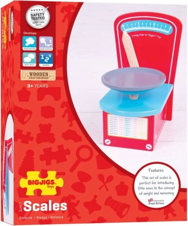 Ez a teljes egészében fából készült, funkcionális mérleg a Bigjigs Toys-tól ideális kiegészítő a gyerekkonyhába. Főzőcskézés közben a gyerekek gyakorolják a számolást, a súlybecslést és a szociális készségeket a közös játék során.