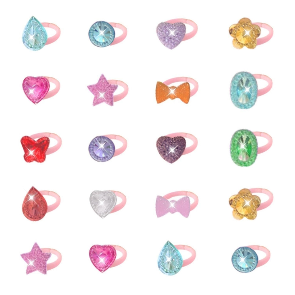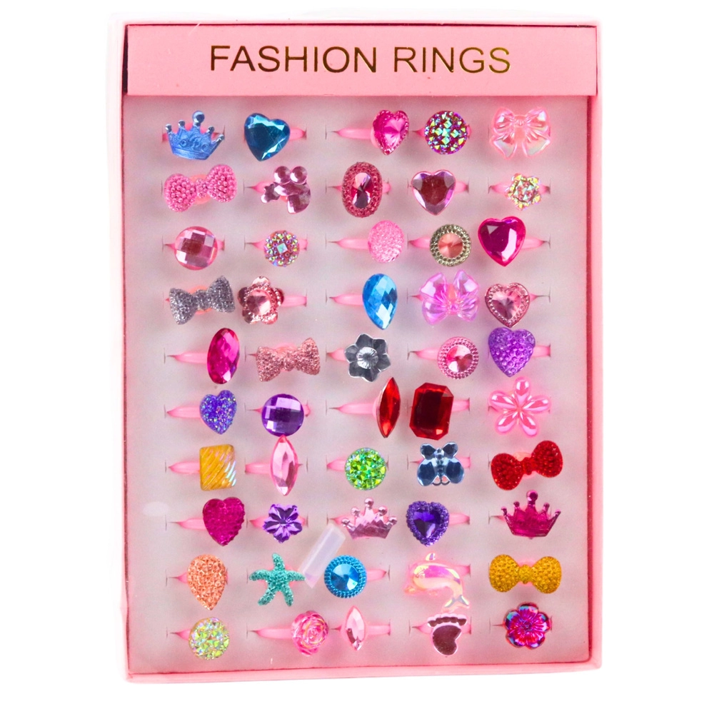 Játékos, fantáziadús szett: 50 darab színes gyerekgyűrű szívecske-, csillag-, korona-, masni-, virág- és nagy „kristály” motívumokkal, mely minden ékszerkedvelő kislány szívét megdobogtatja. A fényesen csillogó, fazettált kövek gyönyörűen verik vissza a fényt, így egyedi ragyogást adnak minden jelmeznek és a mindennapi játéknak.