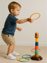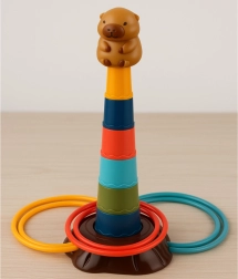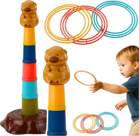 Ez a gyerek karikadobáló játék vidám kapybara motívummal és egyszerűen összeállítható, ötszintes toronnyal érkezik. A feladat a karikákat úgy dobni, hogy a toronyra kerüljenek – a gyerekek így természetes módon gyakorolják a pontosságot, a koncentrációt és a kéz–szem koordinációt. A könnyű és biztonságos műanyag elemek kellemes fogásúak, és a kisebbeknek is megfelelőek.