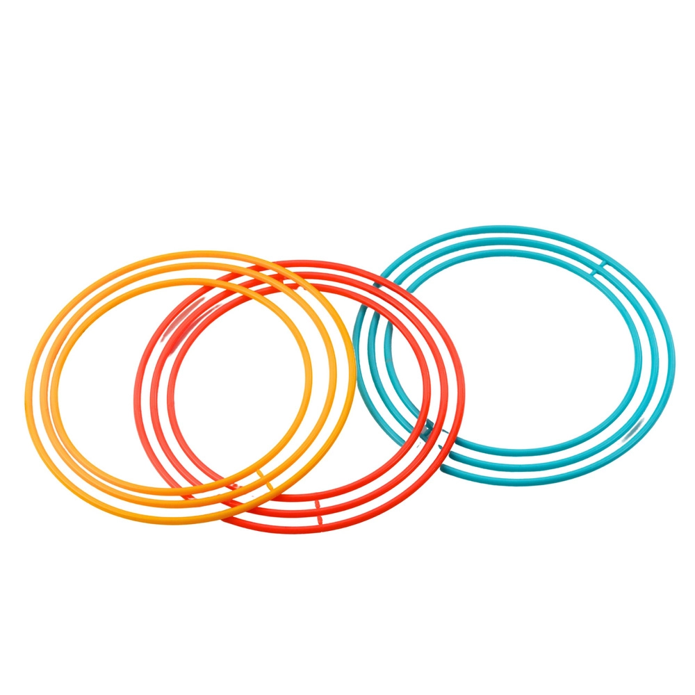 A készlet 9 karikát tartalmaz (3 nagy, 3 közepes, 3 kicsi), így könnyen állítható a nehézségi szint és a vidám versengés.
